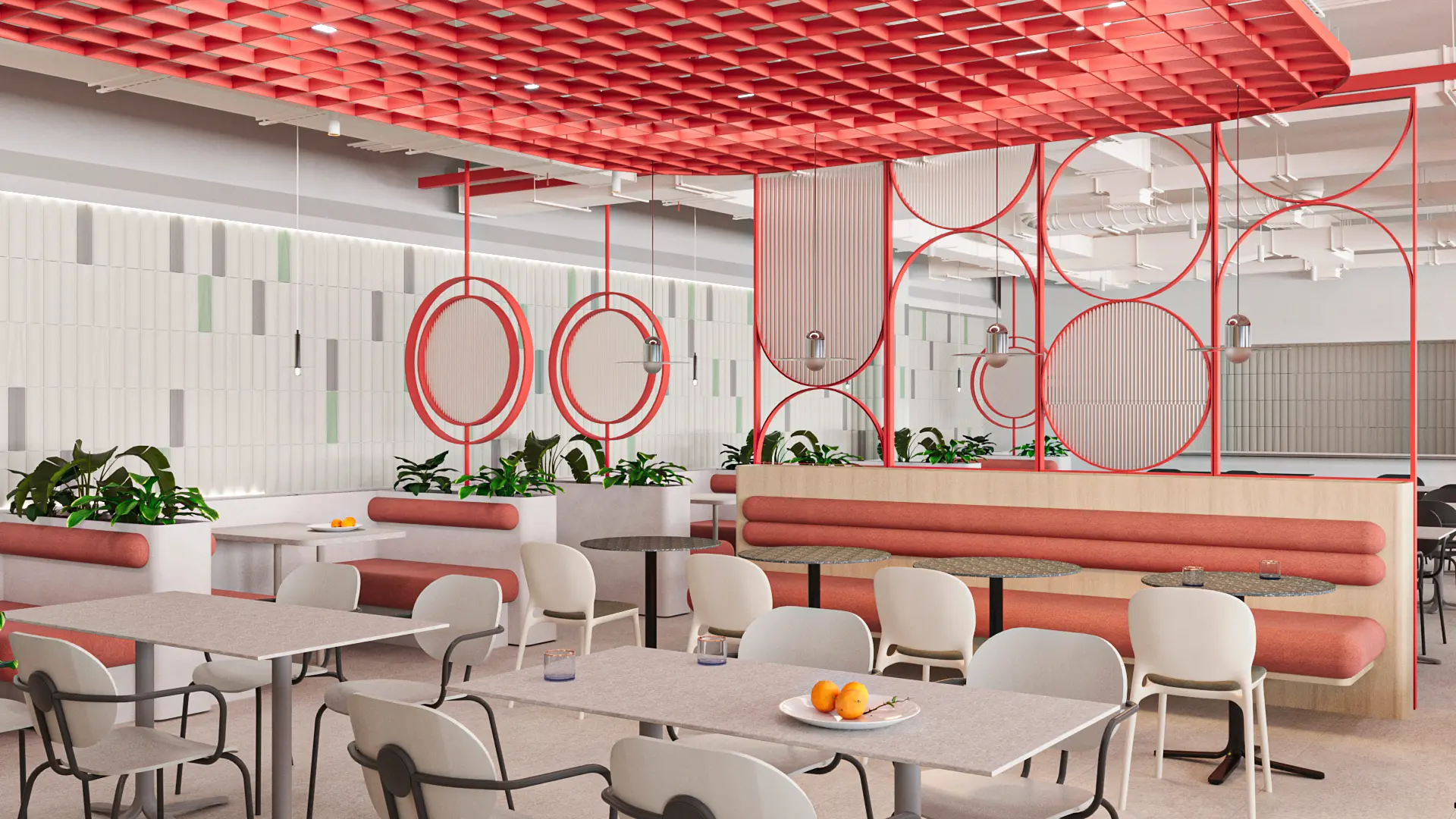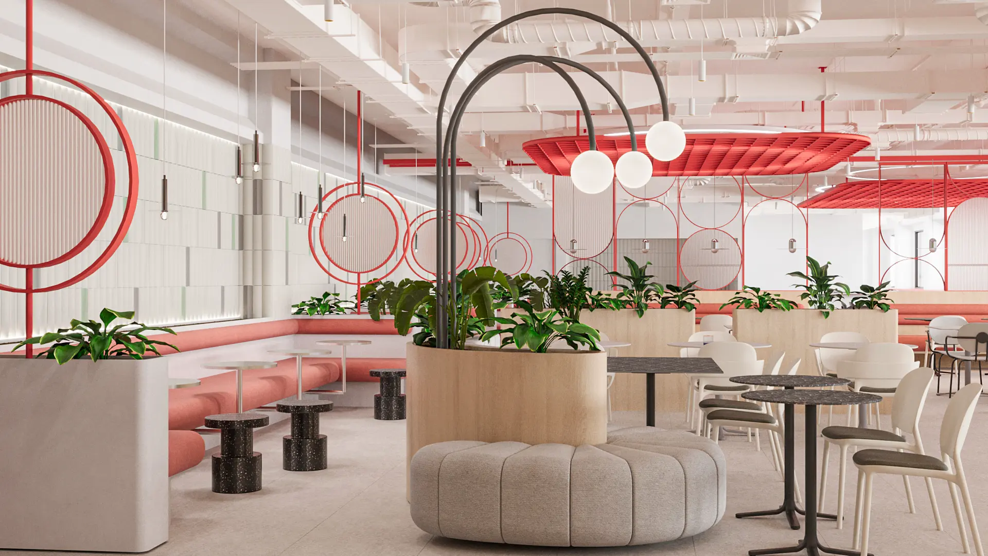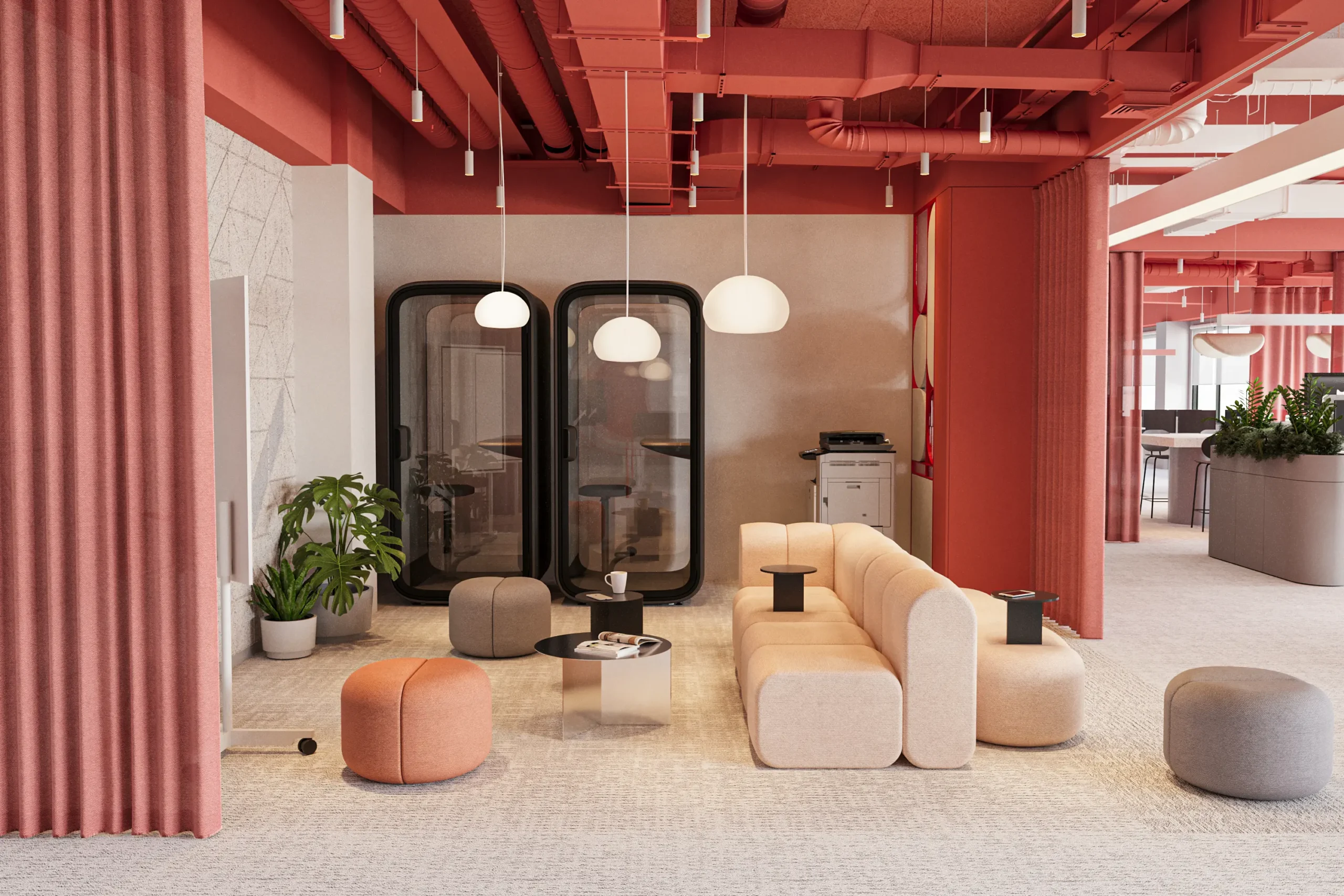 The dominance of warm tones derived from the brand’s color palette, combined with softly rounded furniture forms, enhances a sense of comfort, softening the strong, restrained character of the industrial hall structure.
