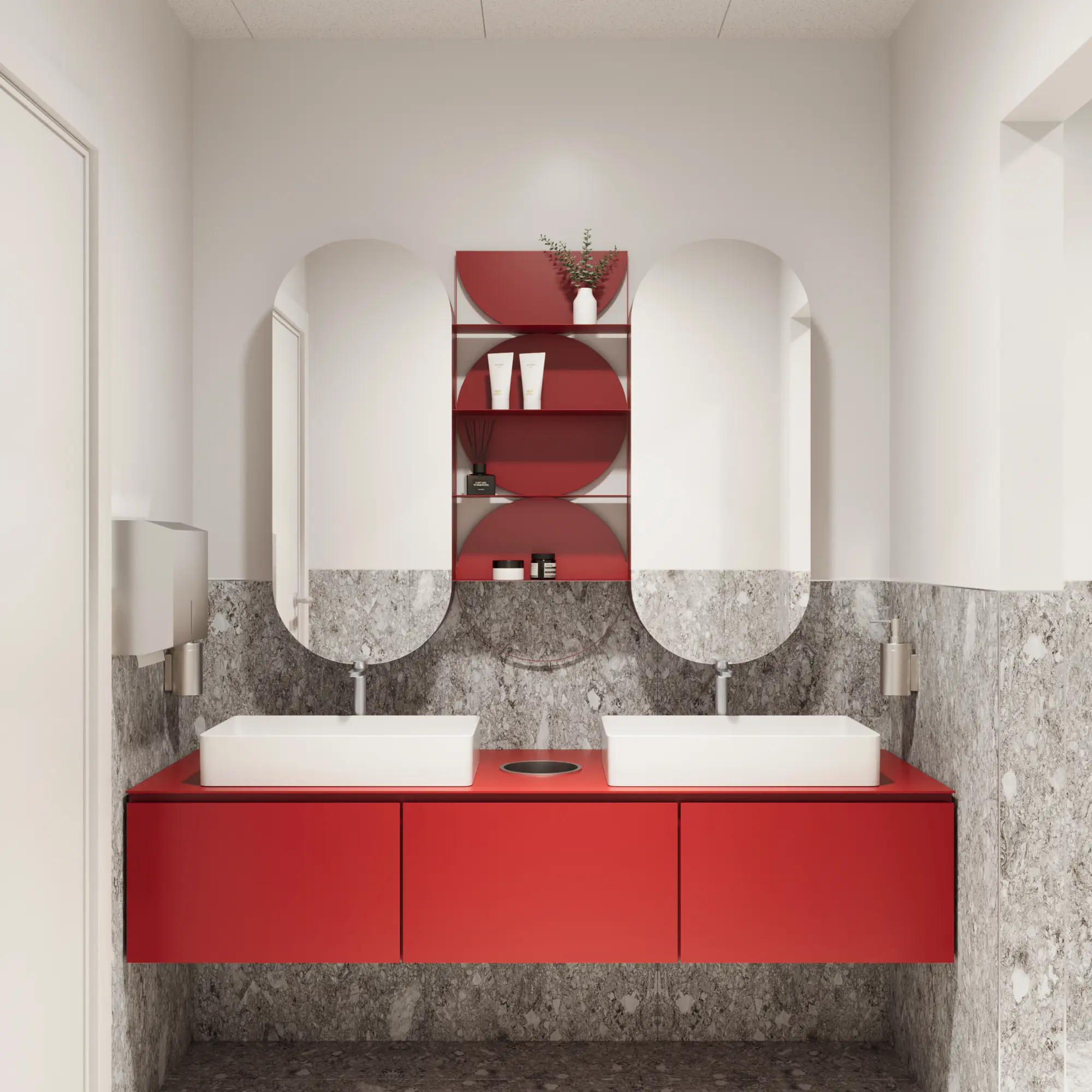 The third conceptual layer, beauty, is expressed through elegant reflective surfaces and the recurring use of circular forms across the office. A key feature embodying this theme is the ribbon-inspired installation in the arrival area, whose flowing form creates a captivating spatial experience, while its raw metal material conveys elegance, clarity, and a sense of high quality.