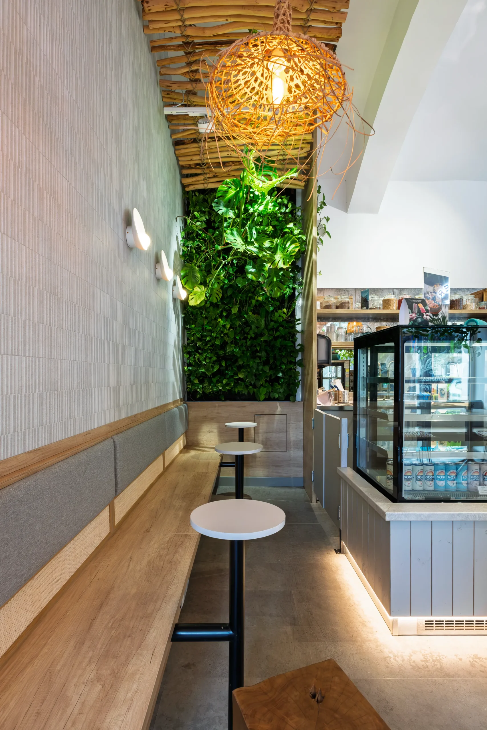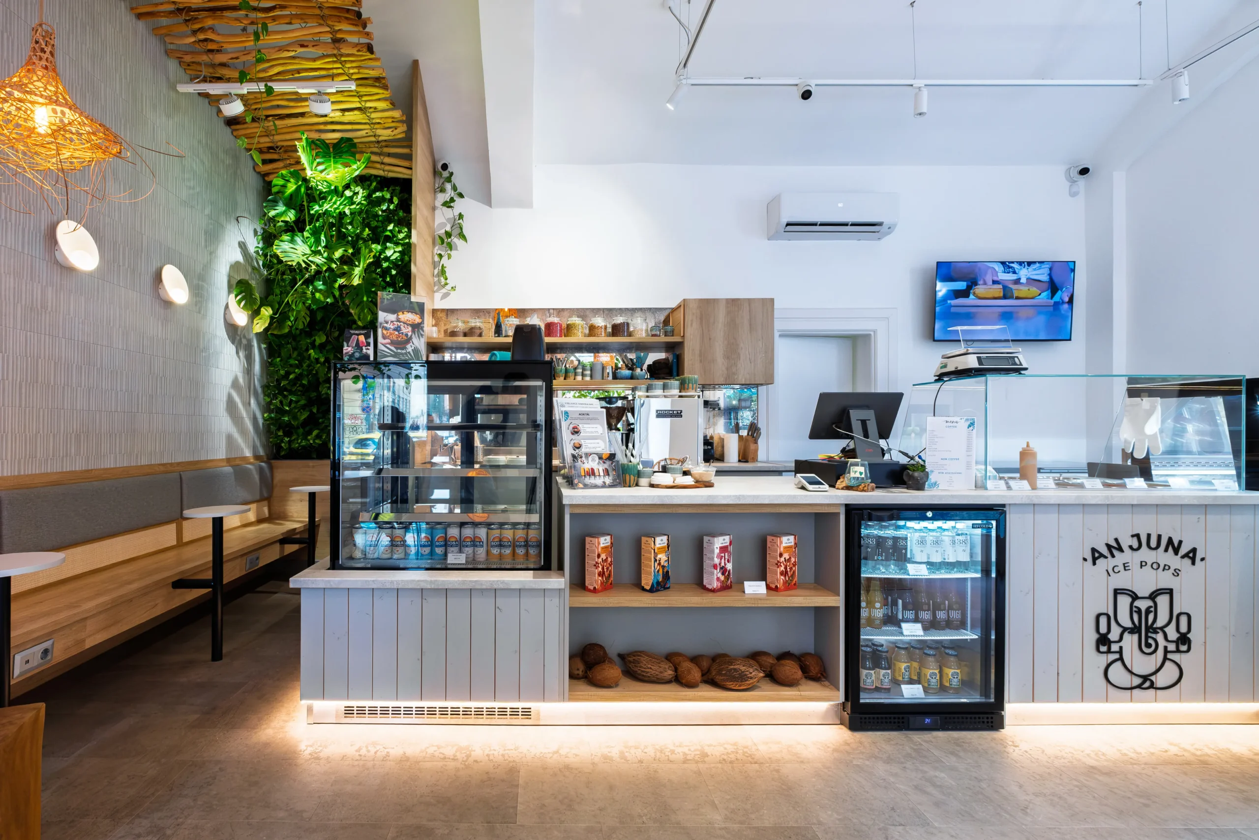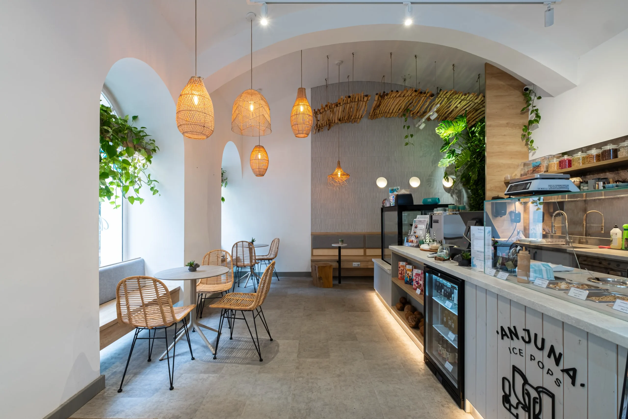 Az Anjuna Ice Pops első egész évben nyitva tartó desszertezője a Király utcában nyílt meg. A belső tér megtervezésénél célunk az volt, hogy visszaadjuk az Anjuna tengerparti hangulatát és napfényes életérzését, amely a márka egyik alapértéke. A korábbi arculathoz képest itt a melegebb tónusok kerültek előtérbe: a fa burkolatok, a kagyló formájú lámpák és az uszadékfából készült árnyékolók mind azt az érzést keltik, mintha a strandon lennénk, egy szörfözés után egy jégkrémmel a kezünkben.