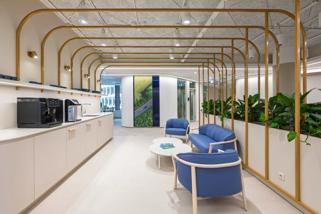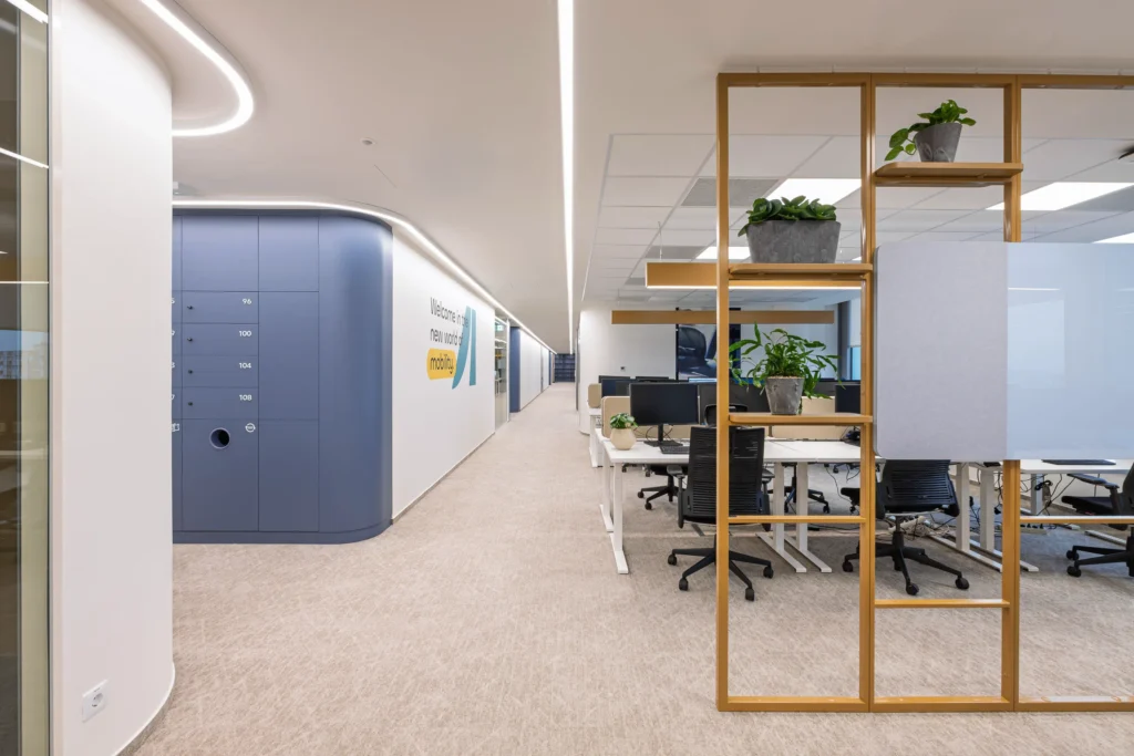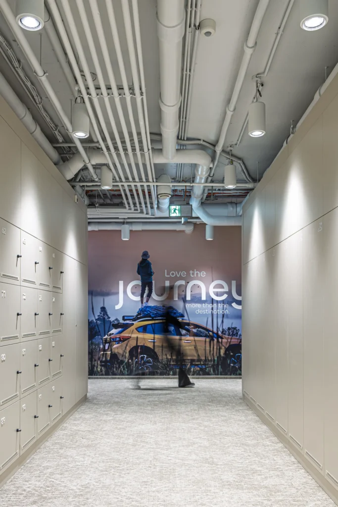 A márka hívószavai a “Flow’ és a ‘Future of Mobility”, így a formavilág az áramlásra, a mozgásra épít: íves vonalvezetésekkel; átjárható zónákkal; hybrid (aktív és passzív) térkapcsolatokkal. Az eredmény egy szerethető, fényes, természetközeli iroda, amely a csapatot inspirálja, és a márka „Better with every move.” ígéretét térélménnyé emeli.