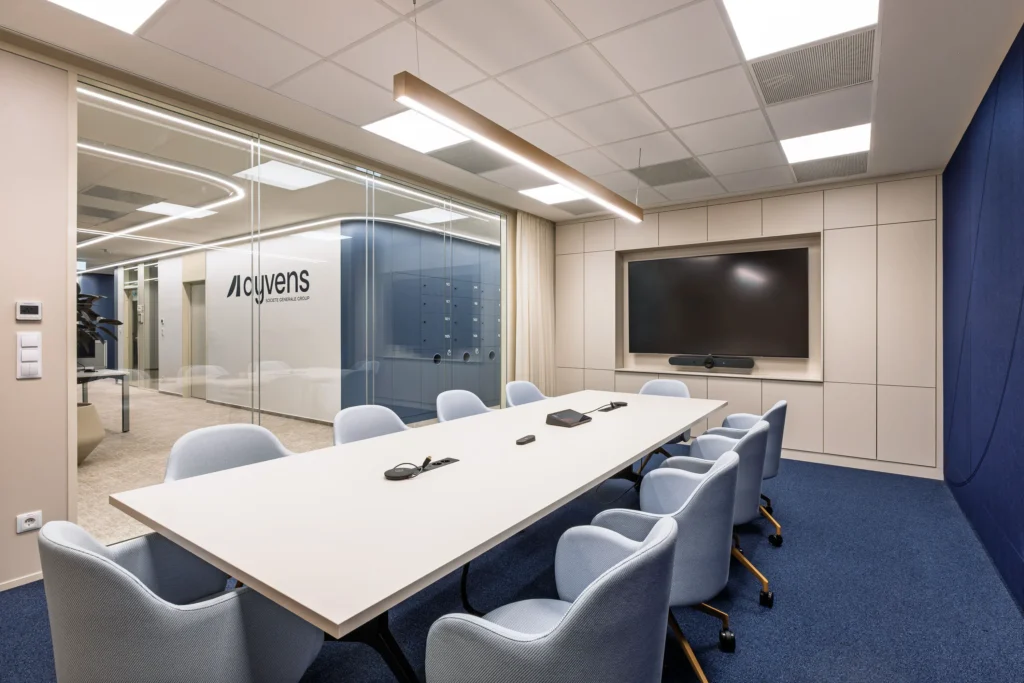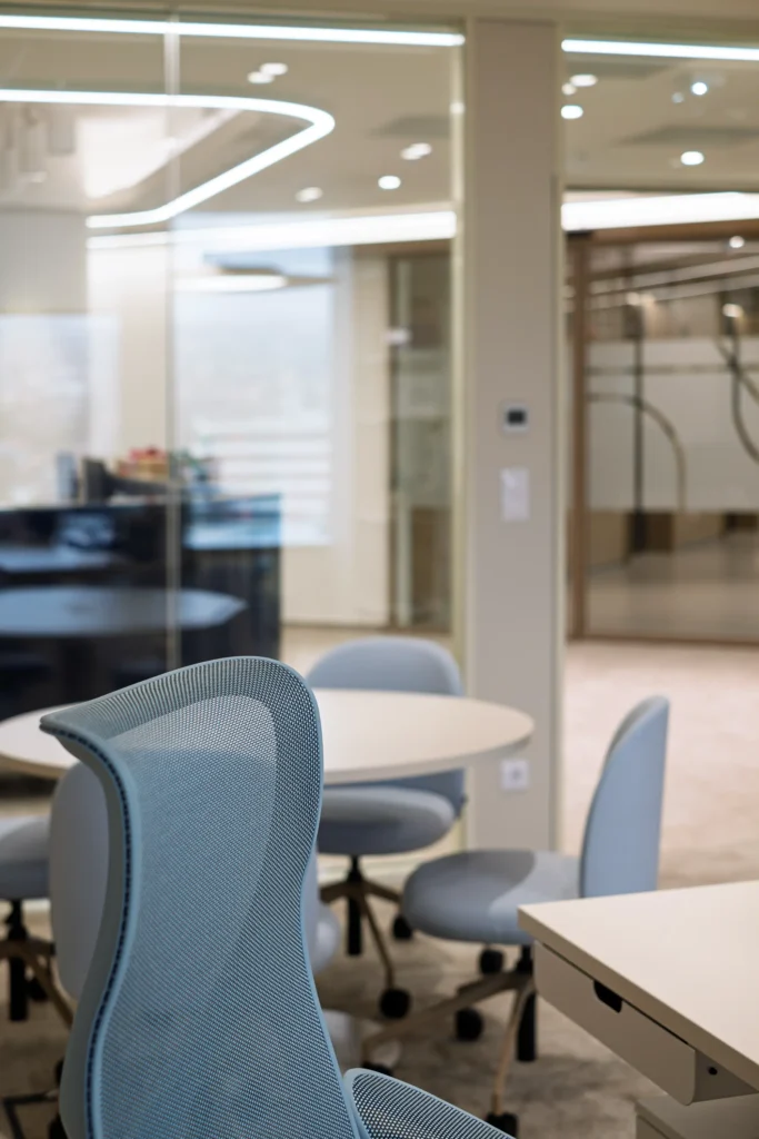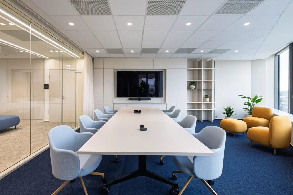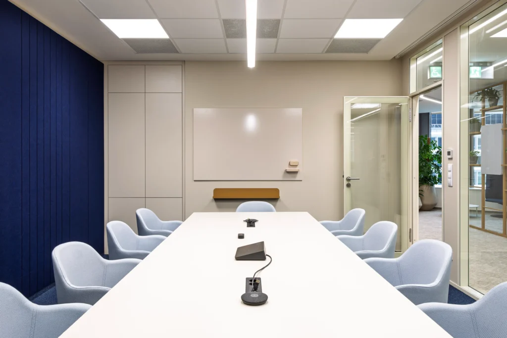 A modern technológiák integrálása a cég innovációs szellemiségét tükrözi. Az érintőpaneles tárgyalófoglaló rendszer az ajtónál valós időben mutatja a szobák státuszát és átláthatóvá teszi a kihasználtságot—így rugalmasan szervezhetik a kollégák mindennapjaikat. A méretezett LED fal + kalibrált AV megoldás minden üléspontról jól olvasható tartalmat és tiszta hangot biztosít, ami a hibrid egyeztetéseket érdemben javítja. Természetes megvilágítás maximalizálása mellett a mesterséges világítási rendszer a közös területeken jelenlét- és napfénykövető szenzorokkal, DALI világításvezérlő rendszerrel működik, így mindenhol annyi fény lesz jelen, amennyi az ideális munkavégzéshez kell.