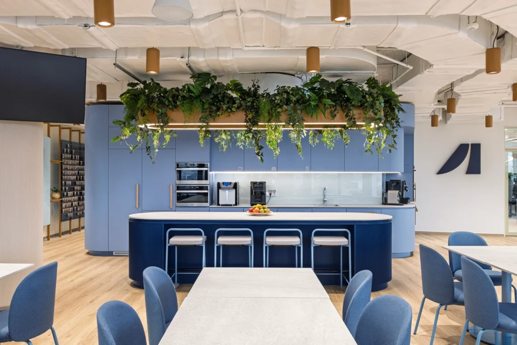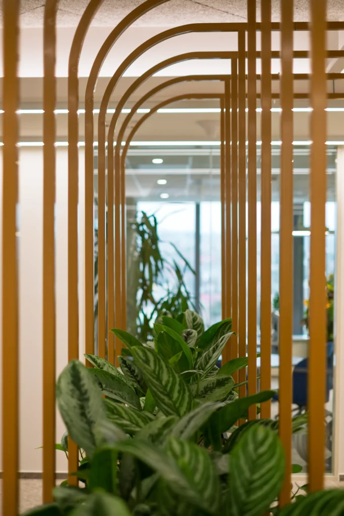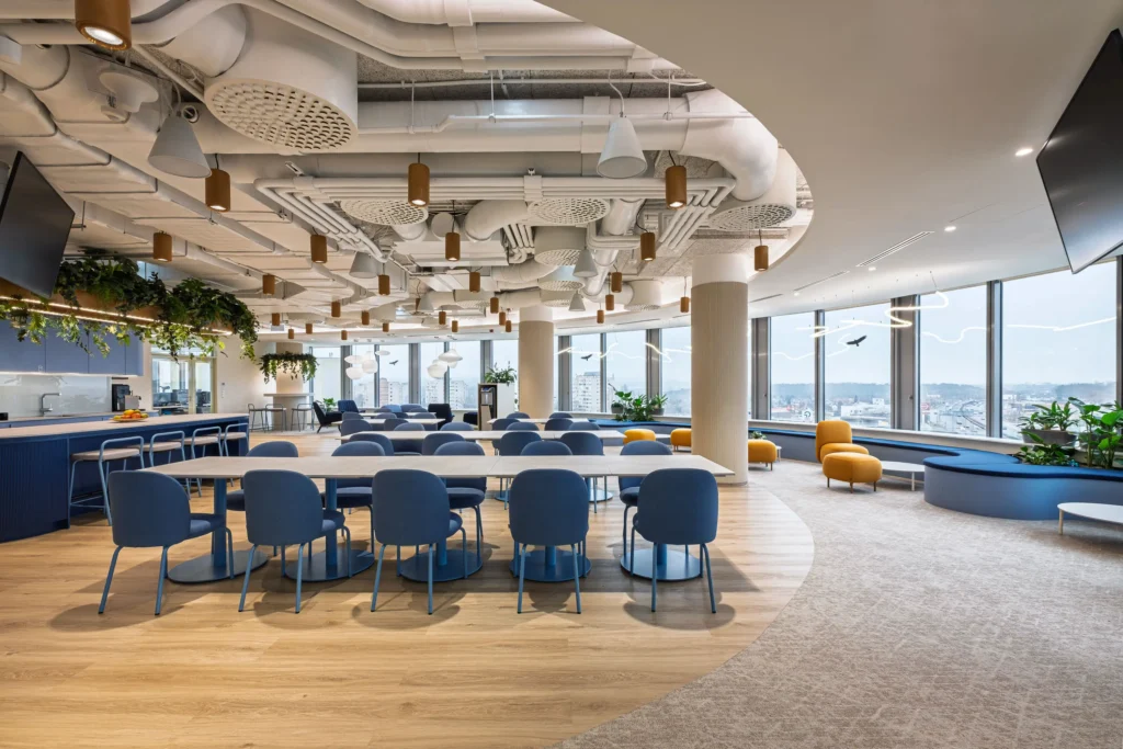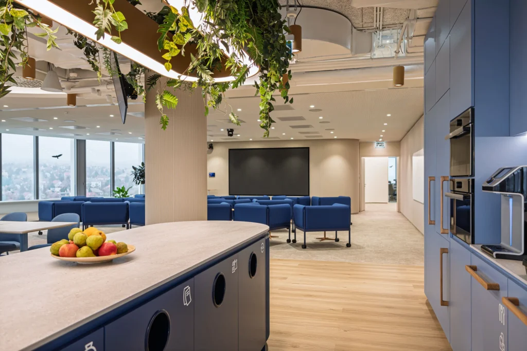 A harsány brand színek puhább, melegebb, lágyabb árnyalatai finoman, térbe integrálva lettek alkalmazva. Industrial jellegű látszó gépészeti területekkel és zártabb, standard mennyezetekkel jelöltünk ki különböző aktivitású zónákat, melyek célzott hangelnyelési felületekkel párosulnak. Célirányos forma- és színvilággal megválasztott kaspókba helyezett növények, függő zöld installációk bizonyítottan csökkentik a stresszt, javítják a fókuszt és a közérzetet. A hangulat így fiatalos, dinamikus, miközben kényelmet és otthonosságot is sugároz.