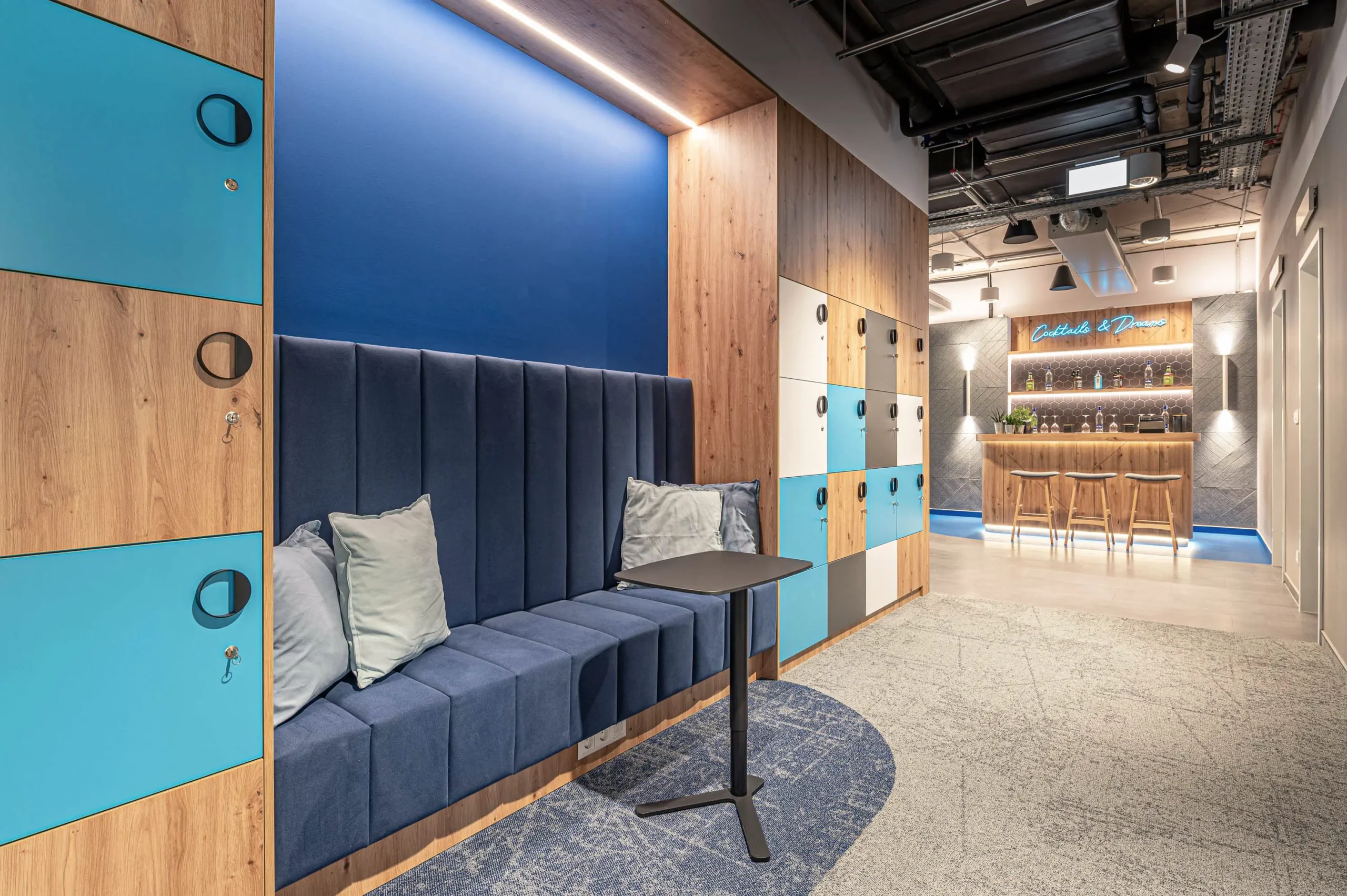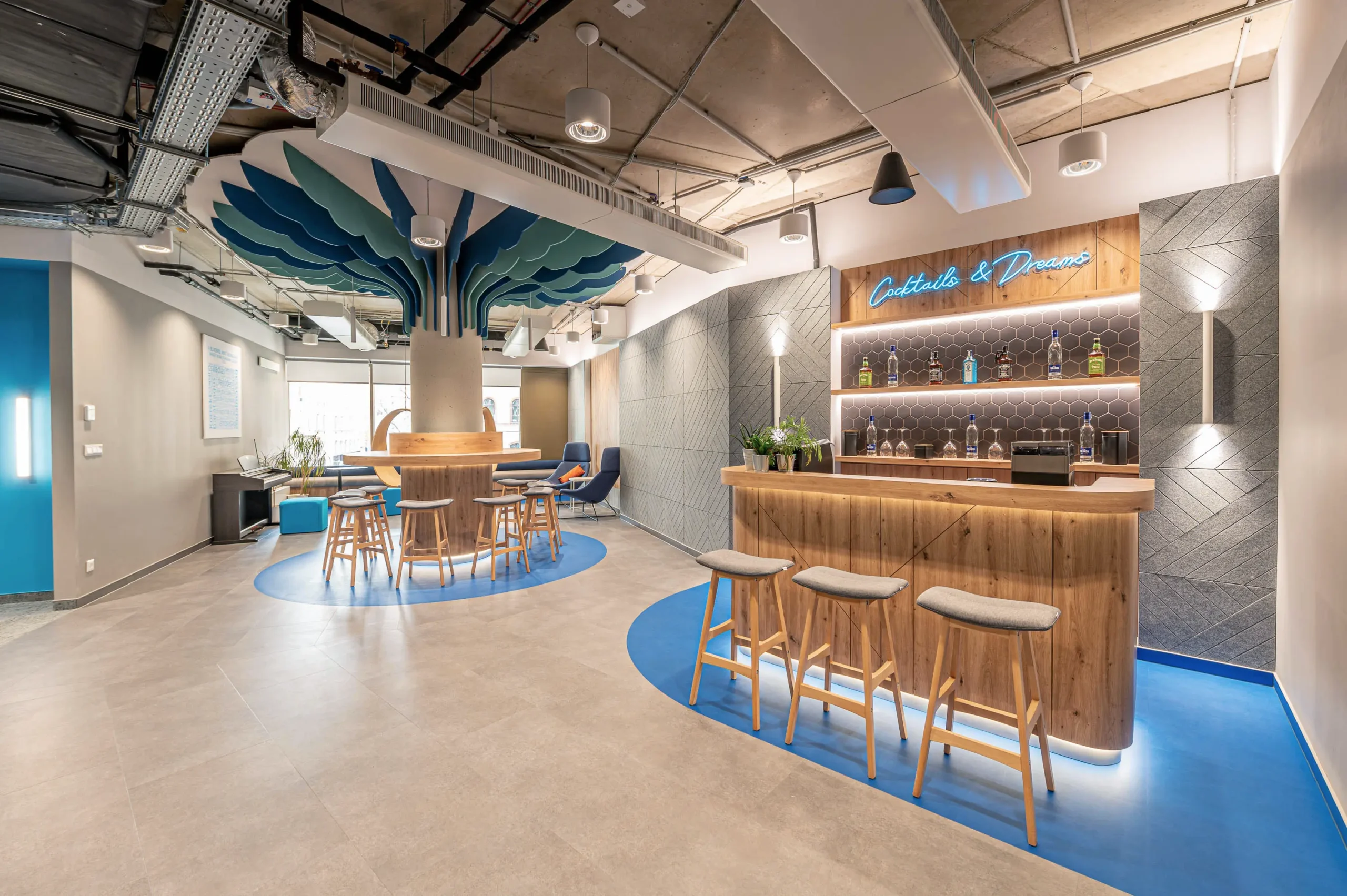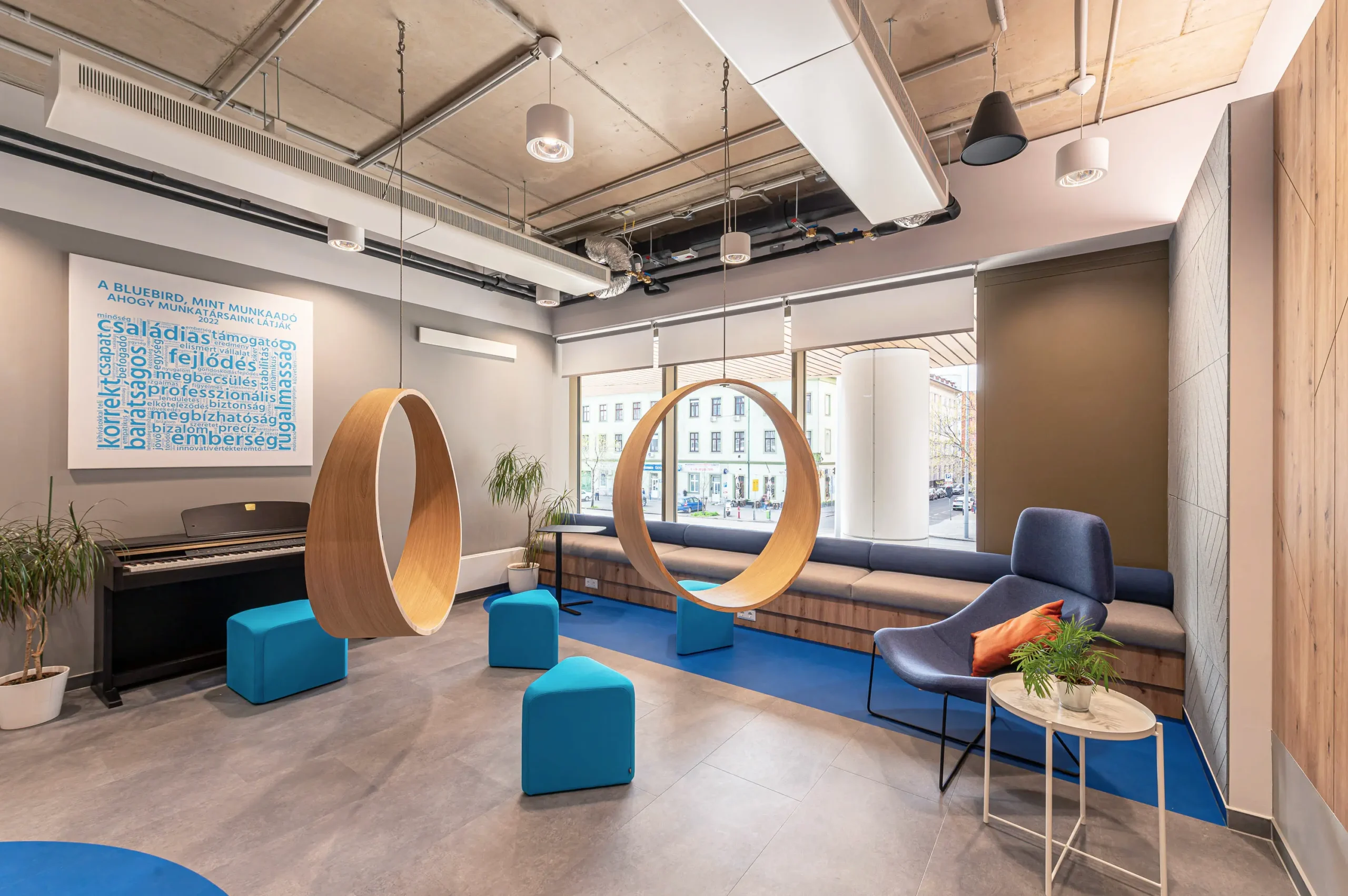 A Bluebird budapesti irodáját a H2Offices komplexumban (Váci út 23–27) terveztük, amely a munka és a magánélet harmonikus integrációját célozza. Az iroda kialakítása rugalmas és emberközpontú, a biophilia, a természetes fények és a nyugtató kék árnyalatok alkalmazásával olyan környezetet hoztunk létre, amely egyszerre inspirálja a kreatív együttműködést és biztosítja a fókuszált munkavégzést.