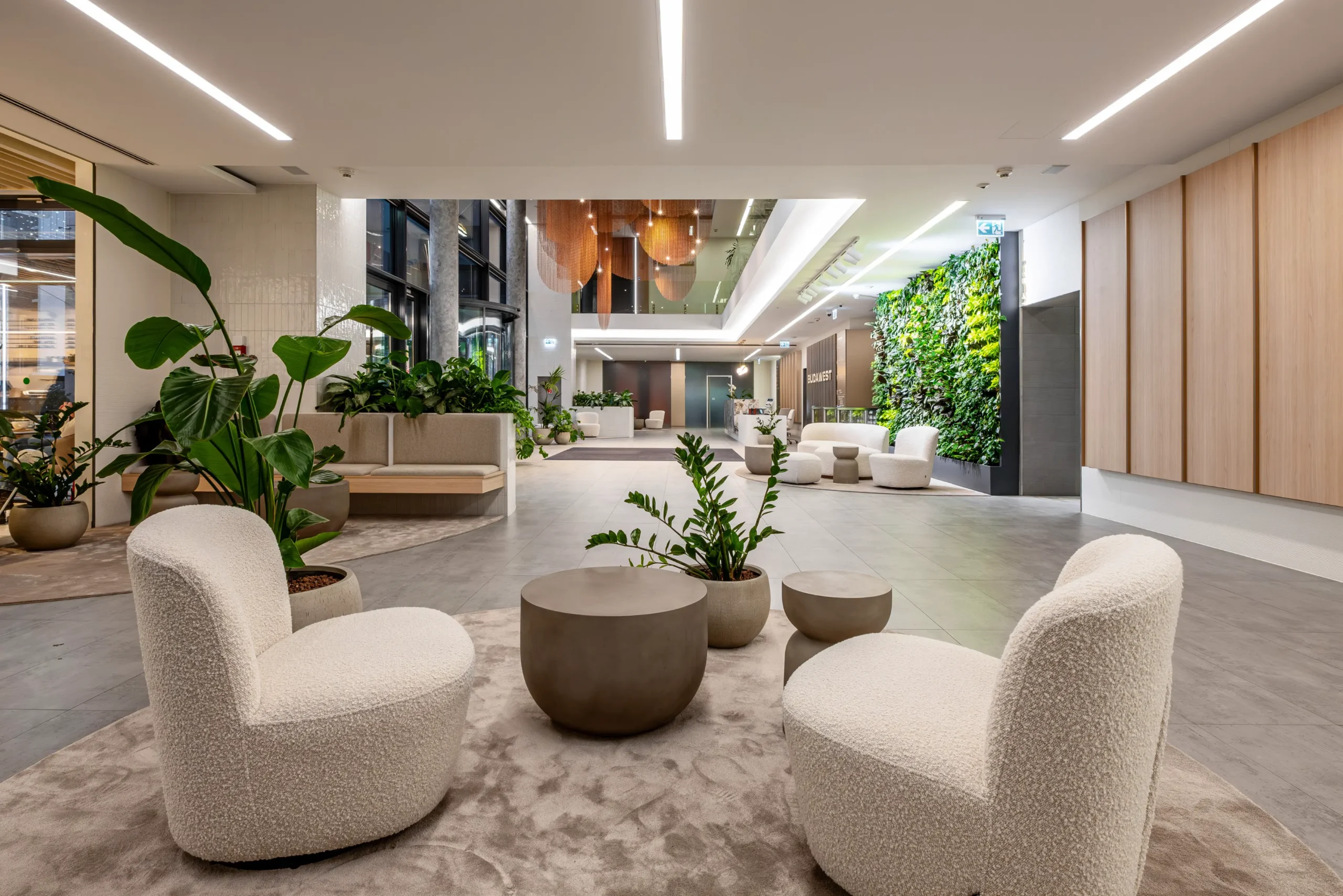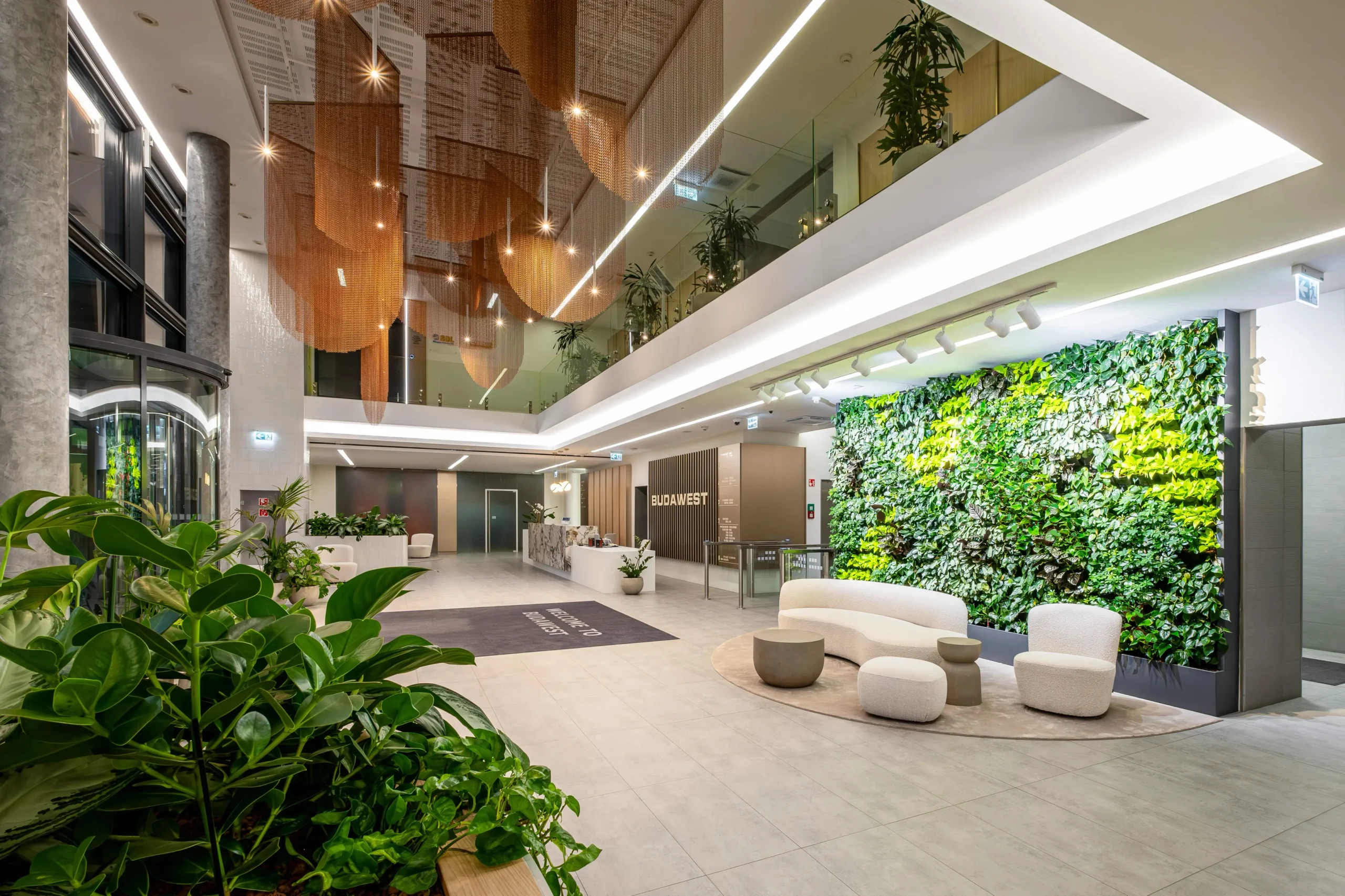 A világos tónusú természetes anyagok, a bronzos fémhatású felületek, a textíliák, valamint a zöld növények és a látványos növényfal friss, hívogató atmoszférát teremtenek, miközben finom eleganciát sugároznak. A lobby központi látványeleme egy bronz láncrendszerből álló, függesztett installáció, amely forgatott elemeinek köszönhetően dinamikus és légies hatást kelt.
