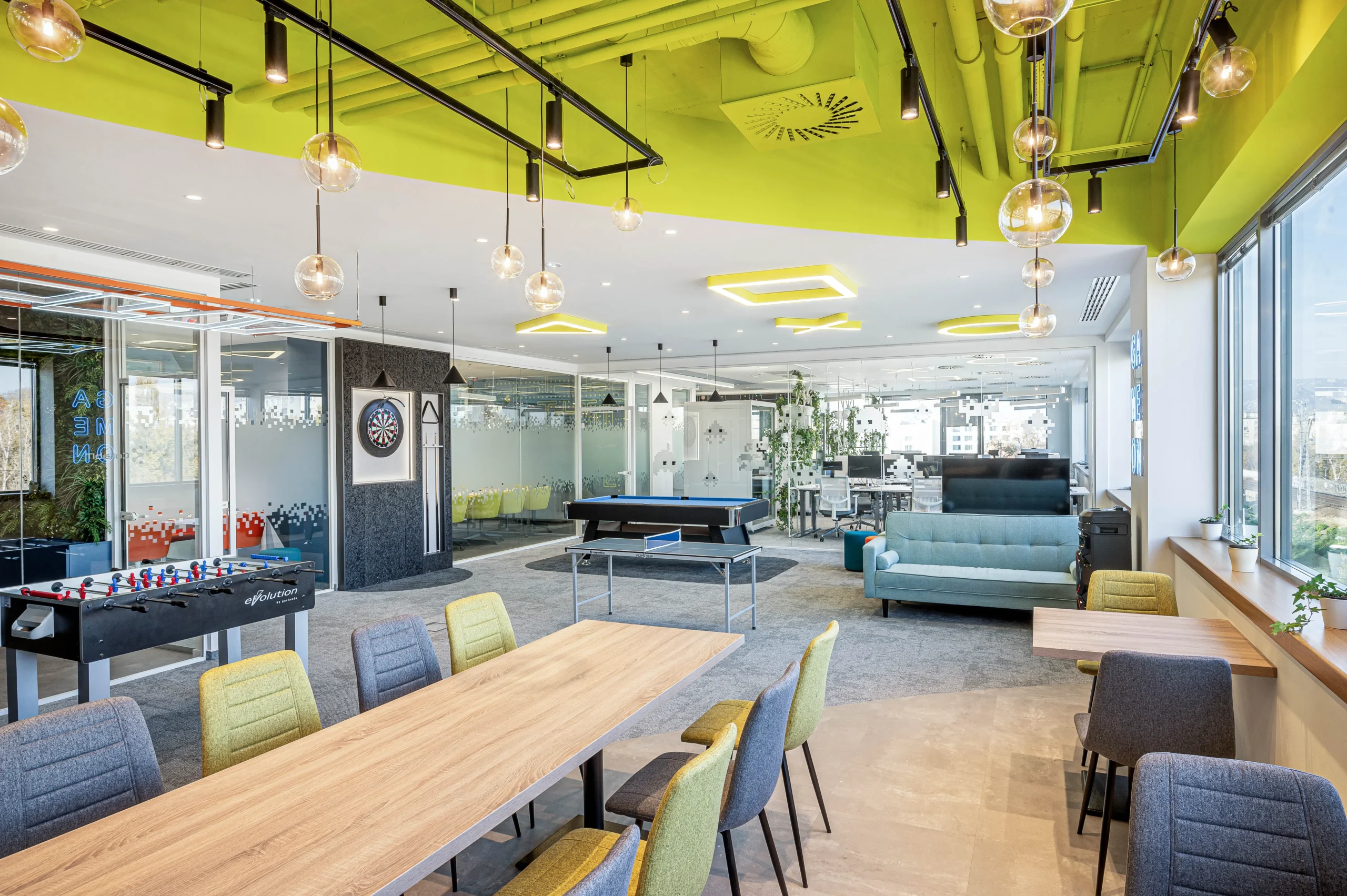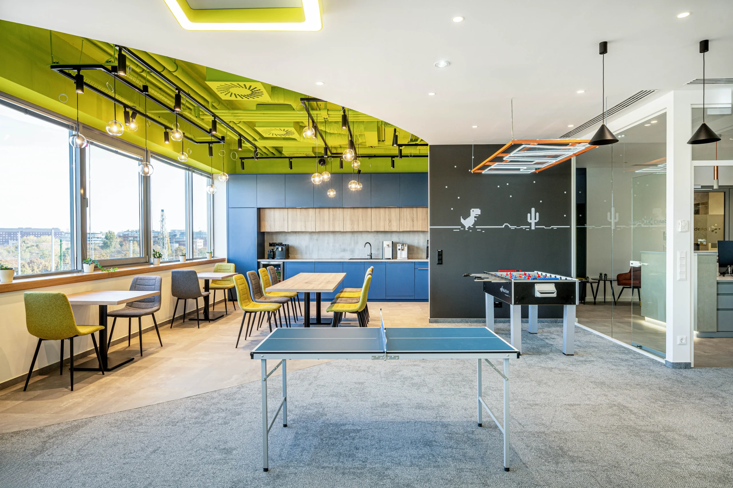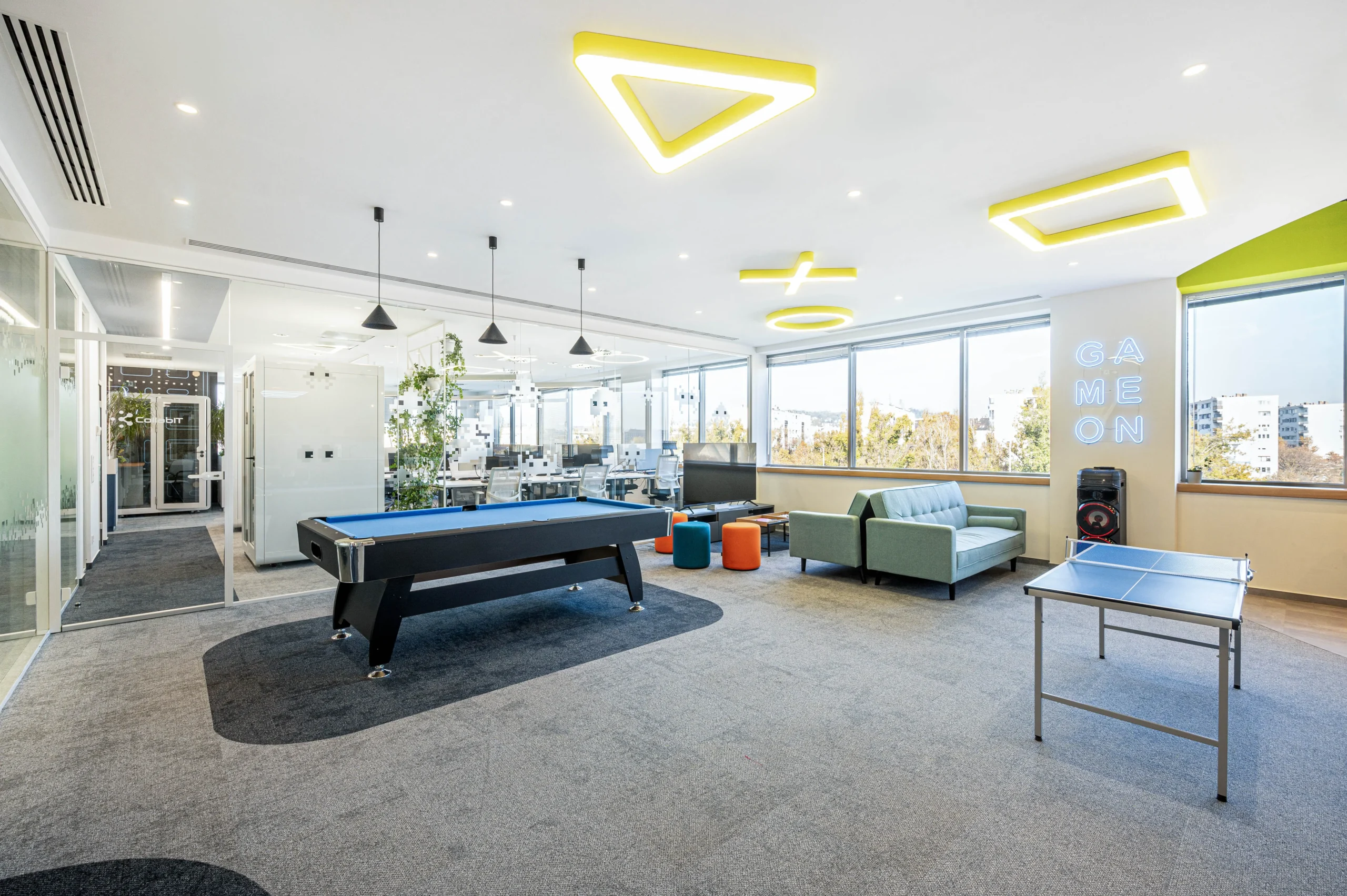 Az iroda központi eleme a közösségi tér és a konyha-étkező, amely nemcsak a munkára, hanem közös szórakozásra is alkalmat biztosít. Helyet kapott egy játékkonzol sarok, ping-pong asztal, darts és egy biliard asztal is.