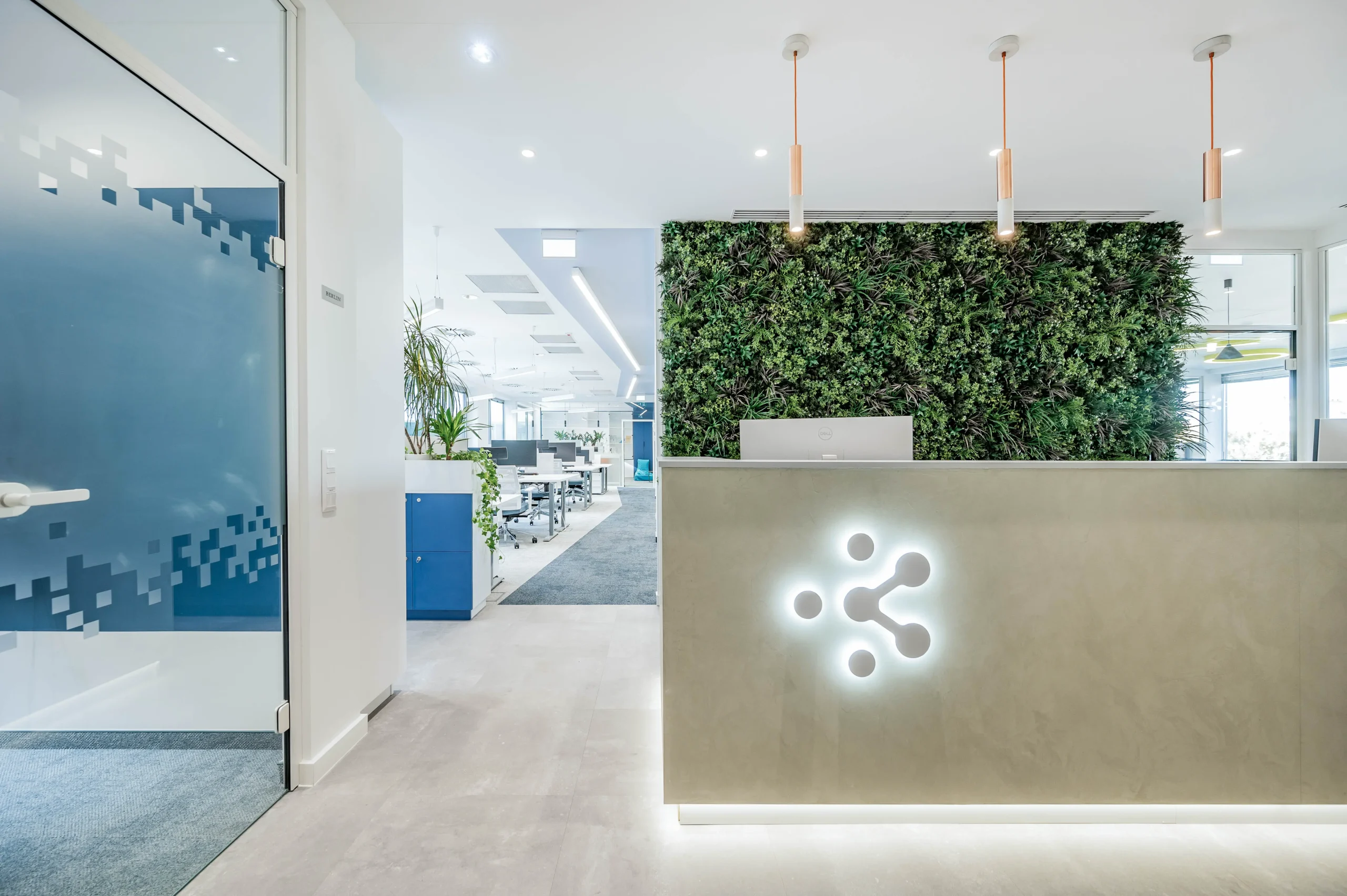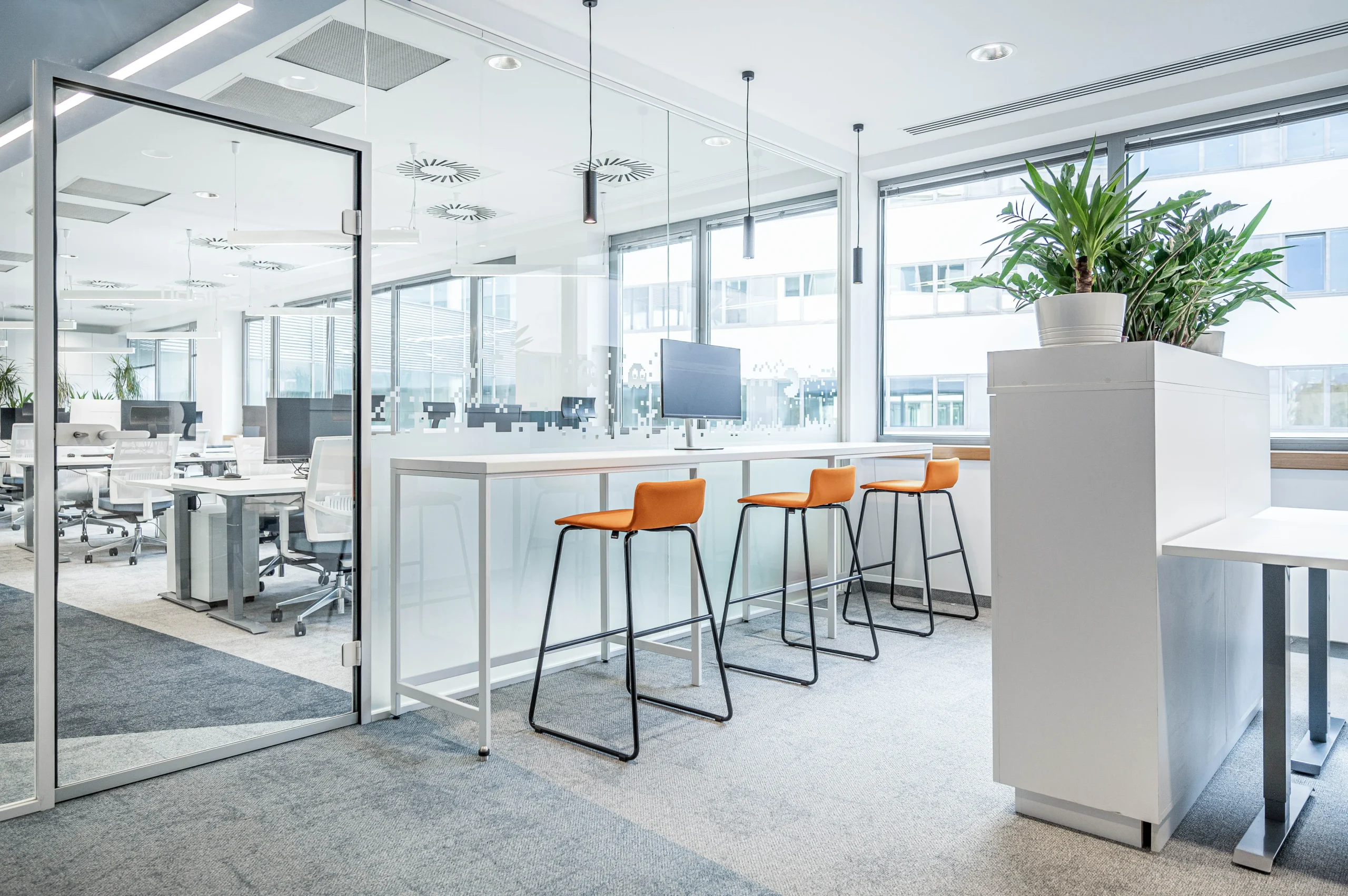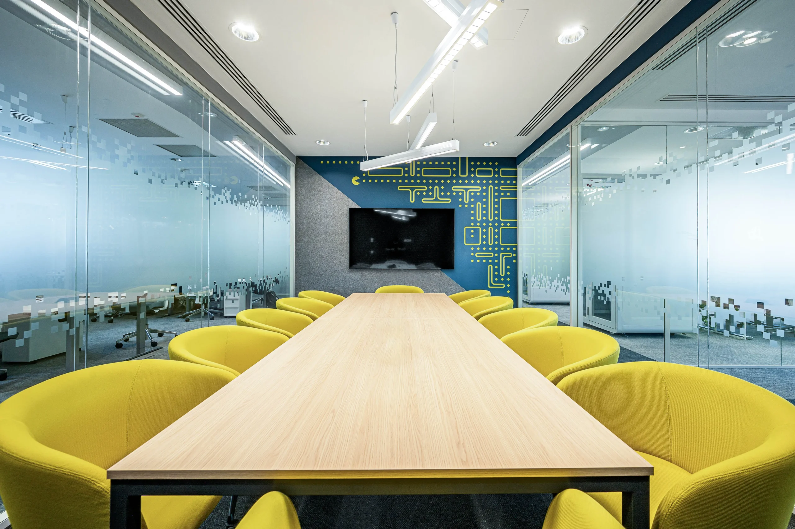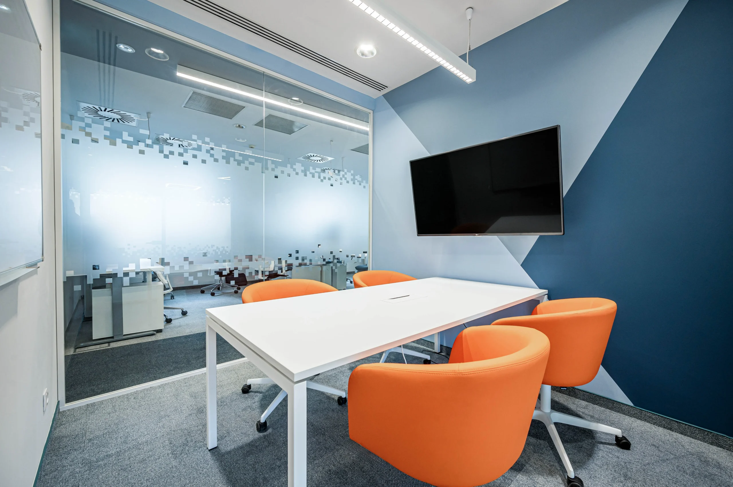 A tárgyalóknál és a nyitott irodatérben az üvegfóliákon szereplő egyedi grafikákkal tettük különlegessé.