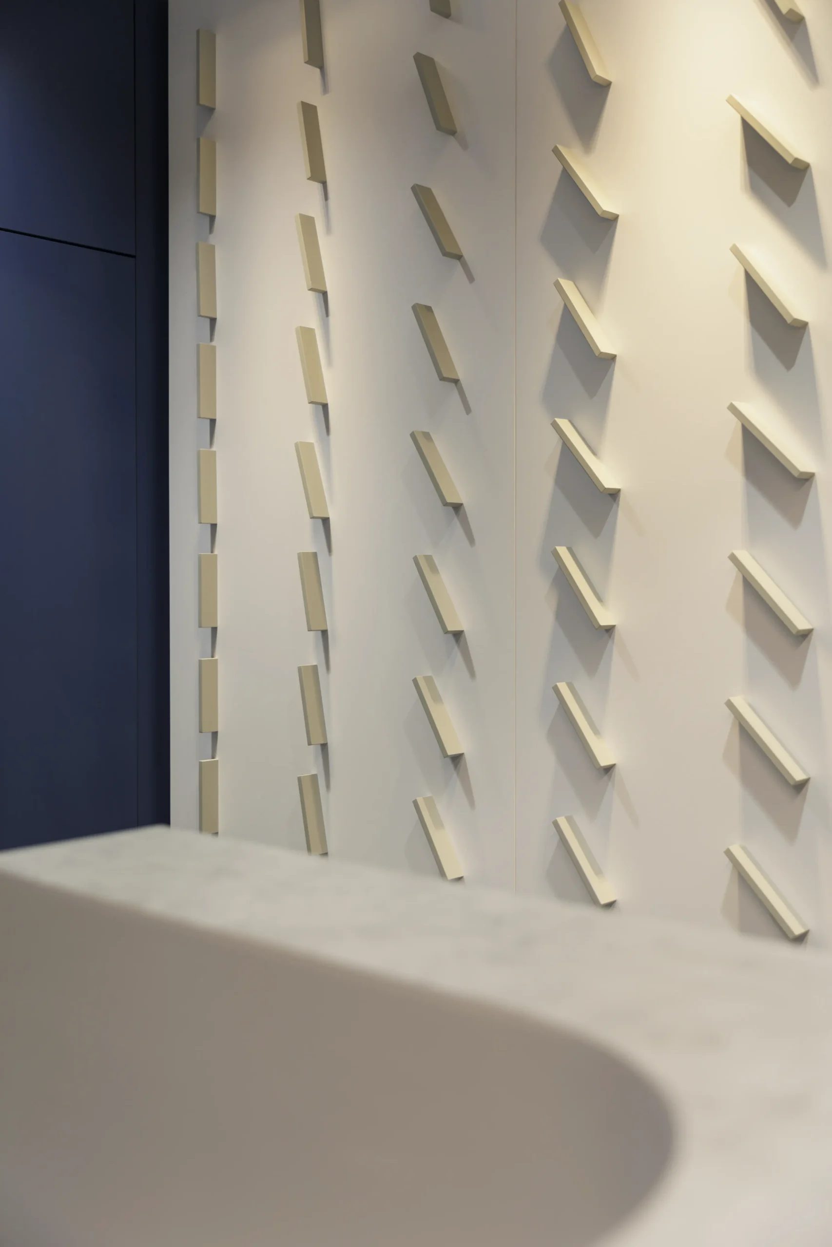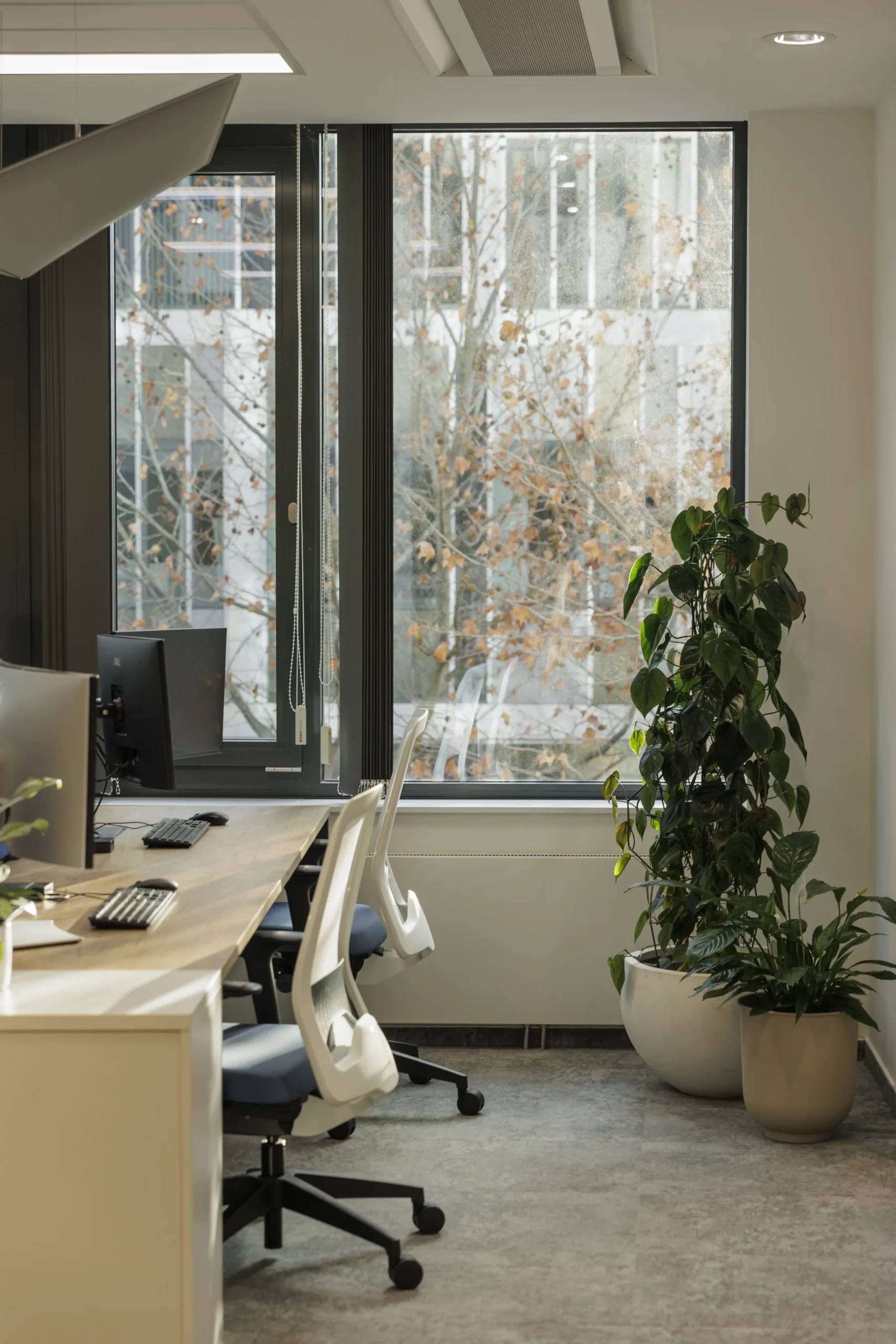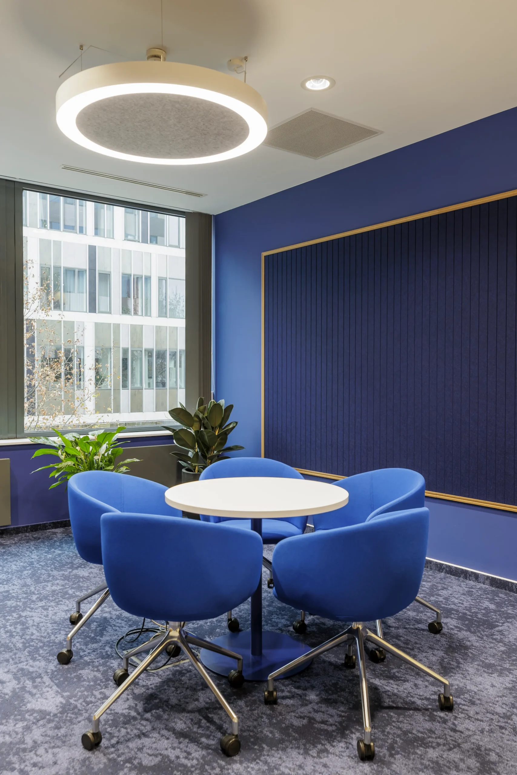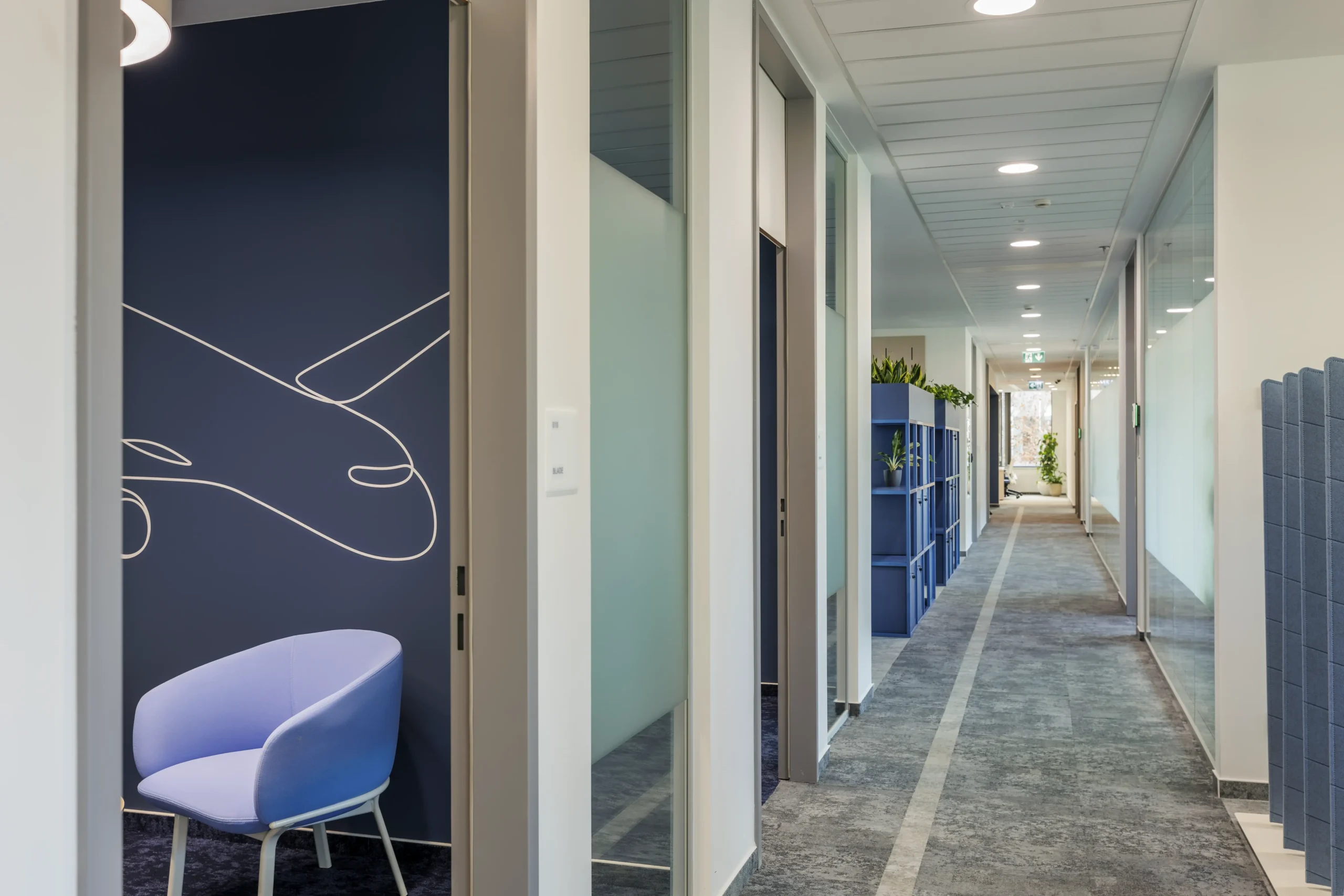 Az iroda belsőépítészeti koncepciója a cég arculatából indul ki: a sötétkék és hűvös szürke árnyalatok elegáns atmoszférát teremtenek, miközben a modern munkakörnyezet funkcionalitása is érvényesül.