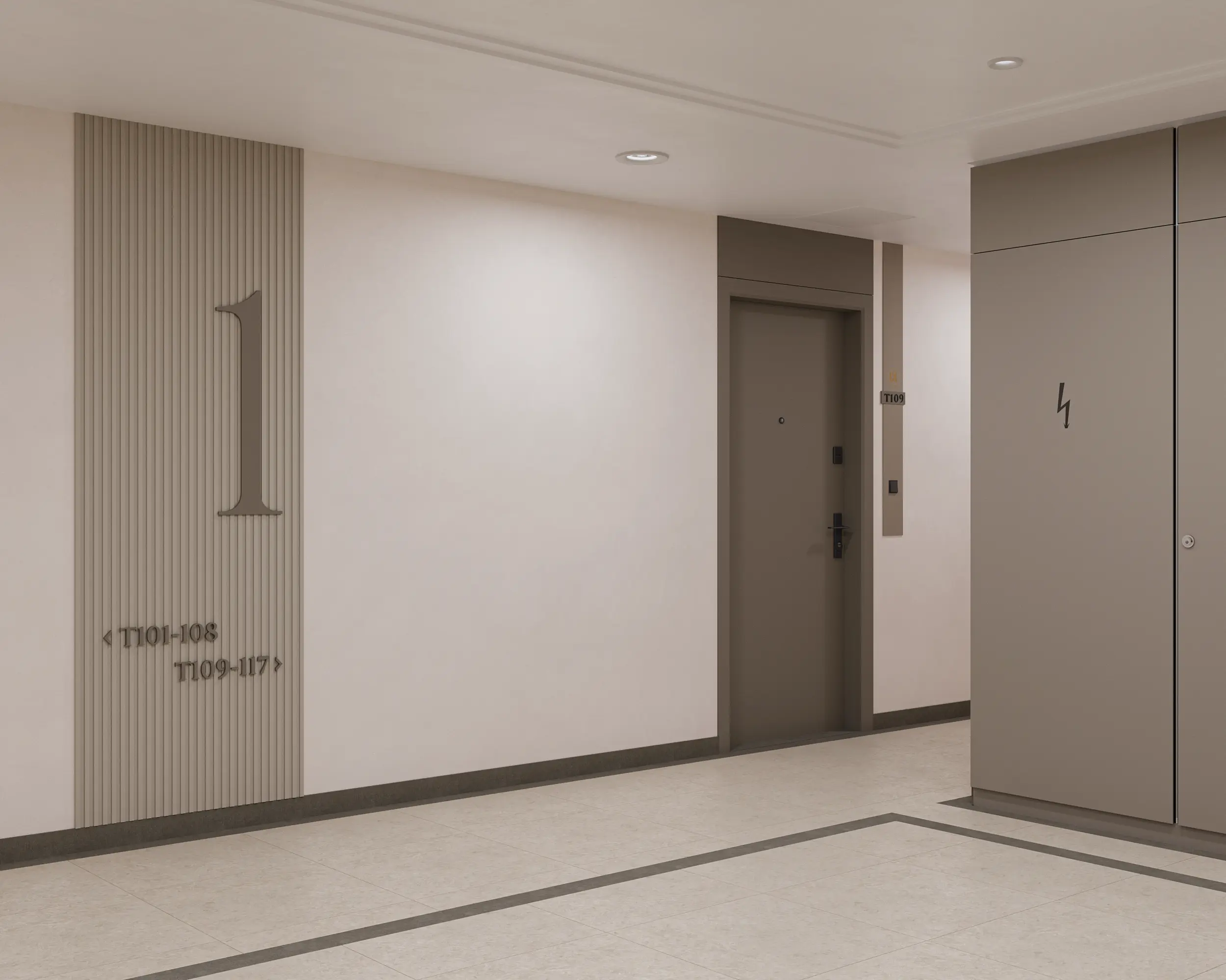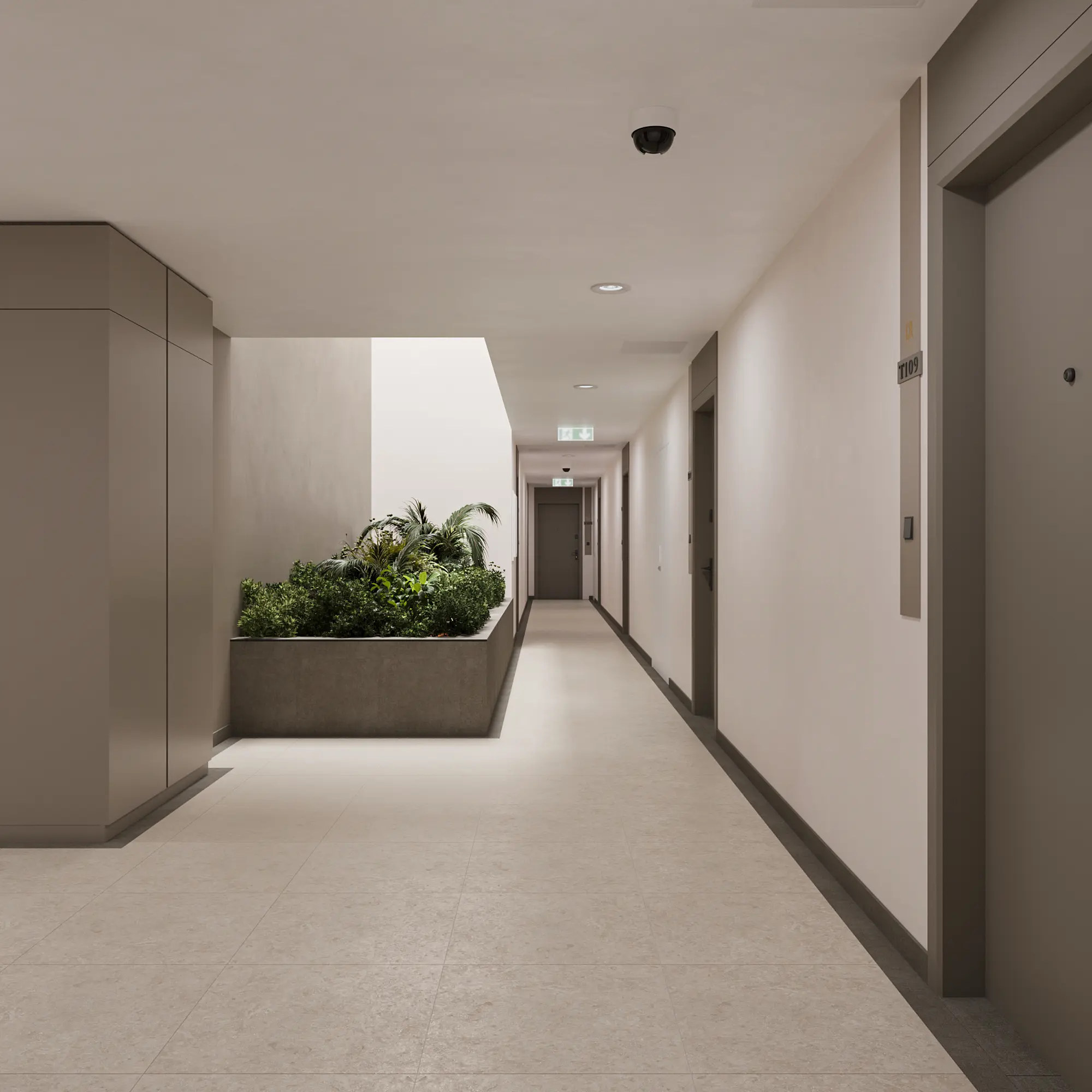 A közlekedők és közösségi terek kialakításánál a visszafogott, meleg tónusú anyaghasználat és a homogén felületek dominálnak, amelyeket finom részletképzések egészítenek ki. A letisztult térszervezés és az egységes anyaghasználat nyugodt, rendezett atmoszférát teremt.