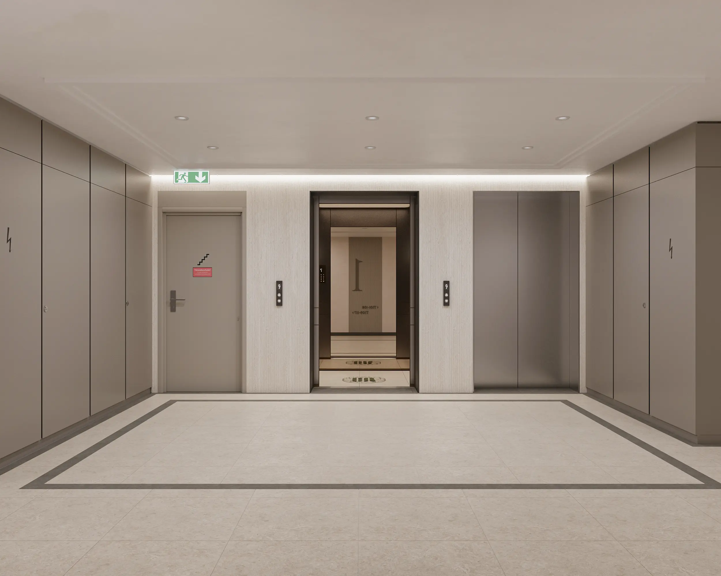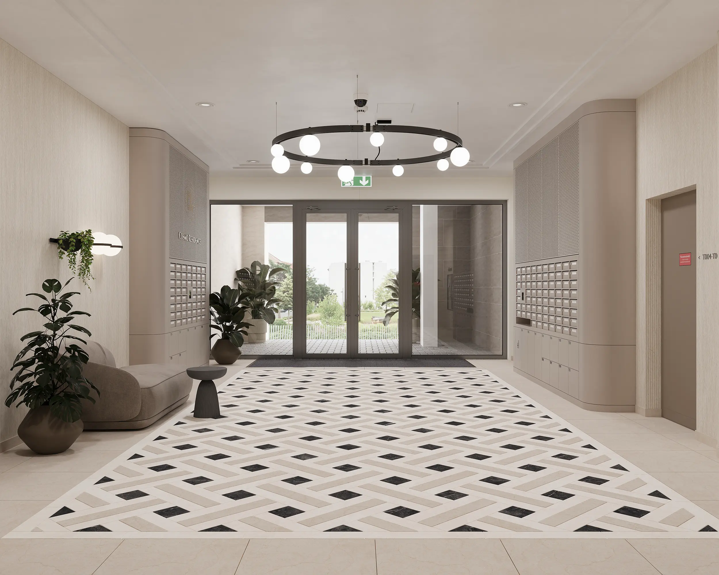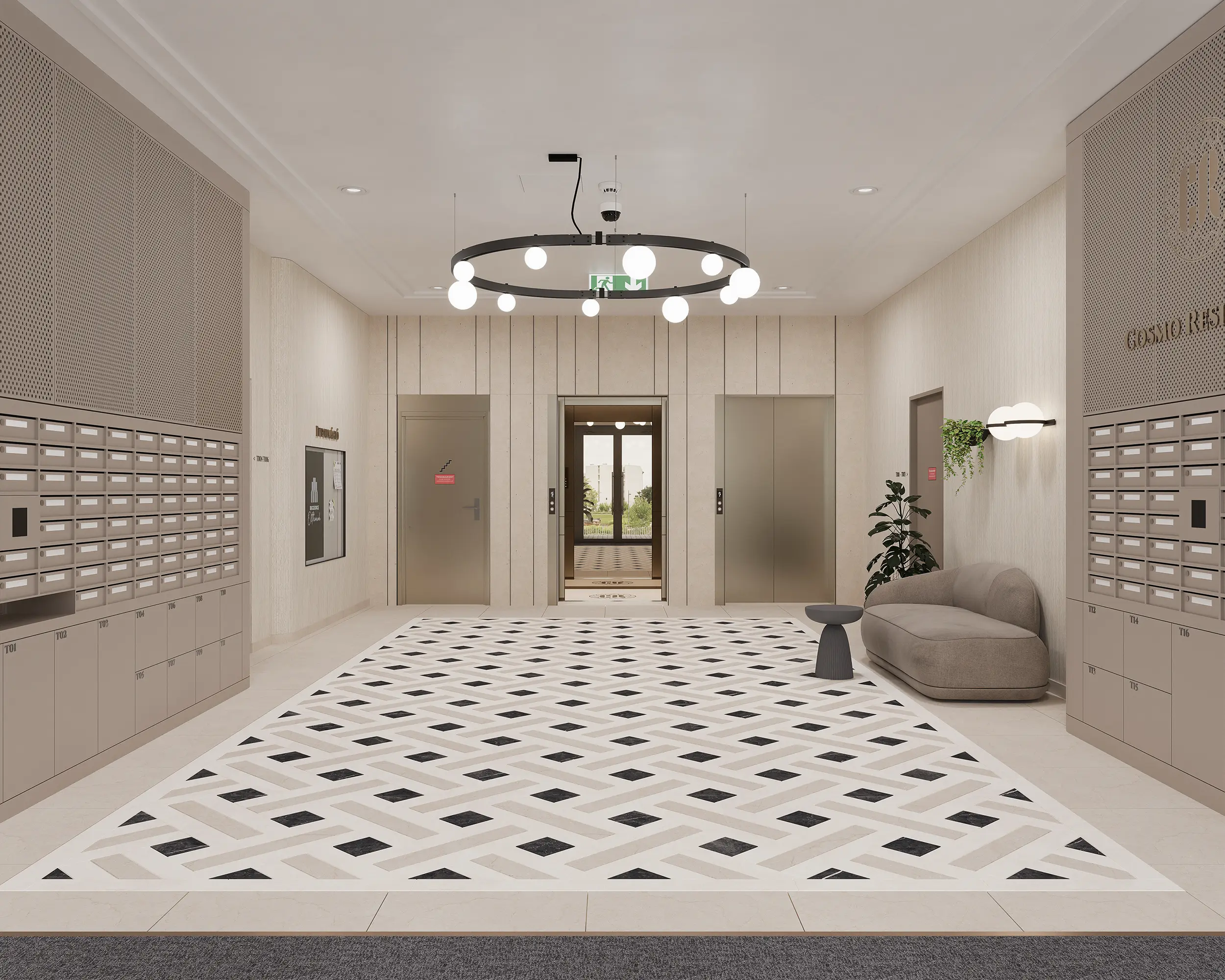 A lobby tér az épület reprezentatív központjaként jelenik meg, ahol az egyedi mintázatú burkolatok, a karakteres világítás és az egységes bútorozás együtt határozza meg a tér identitását. Kiemelt elemként jelenik meg az egyedi tervezésű fém postaláda rendszer, perforált lemezburkolattal és arany logóval, amely egyszerre funkcionális és arculatformáló elemként erősíti a tér karakterét.