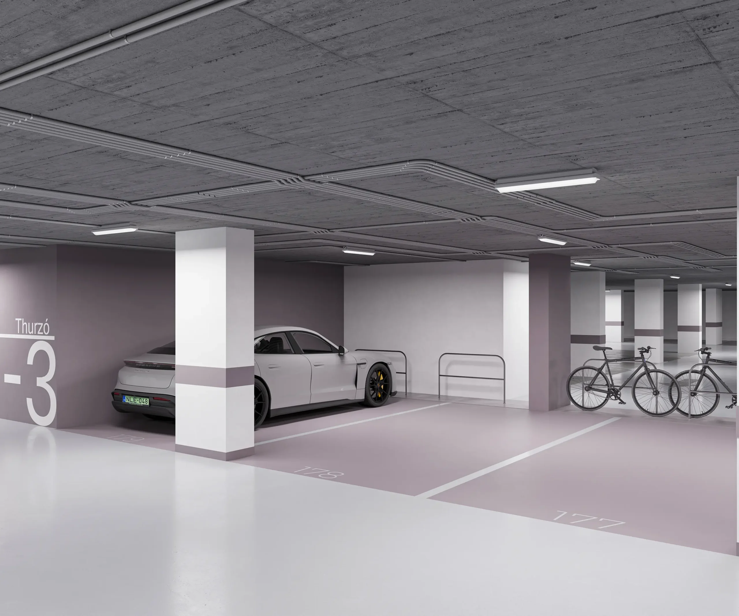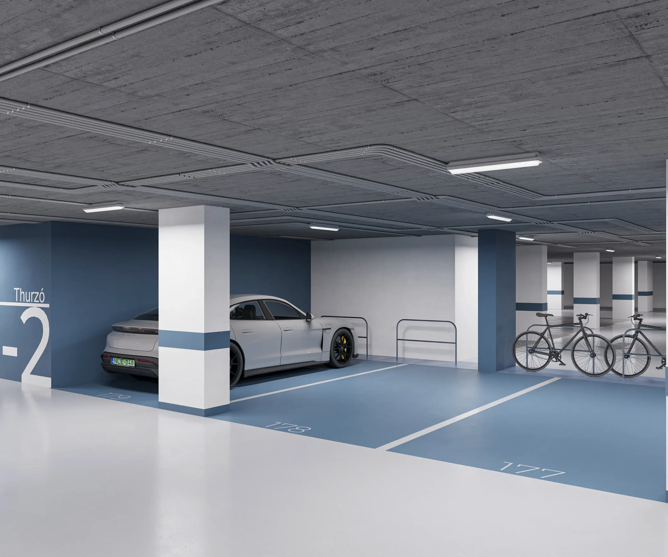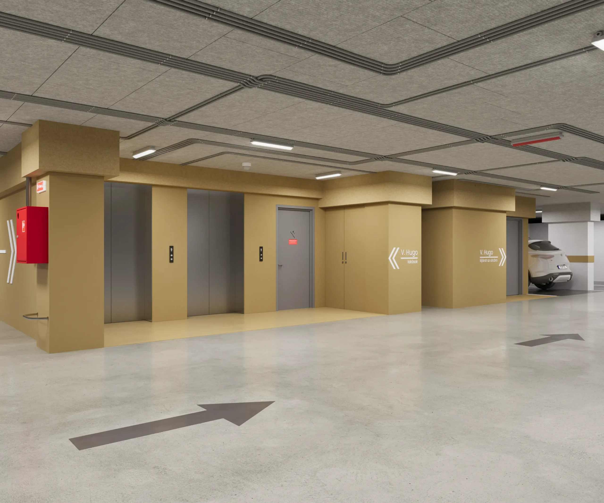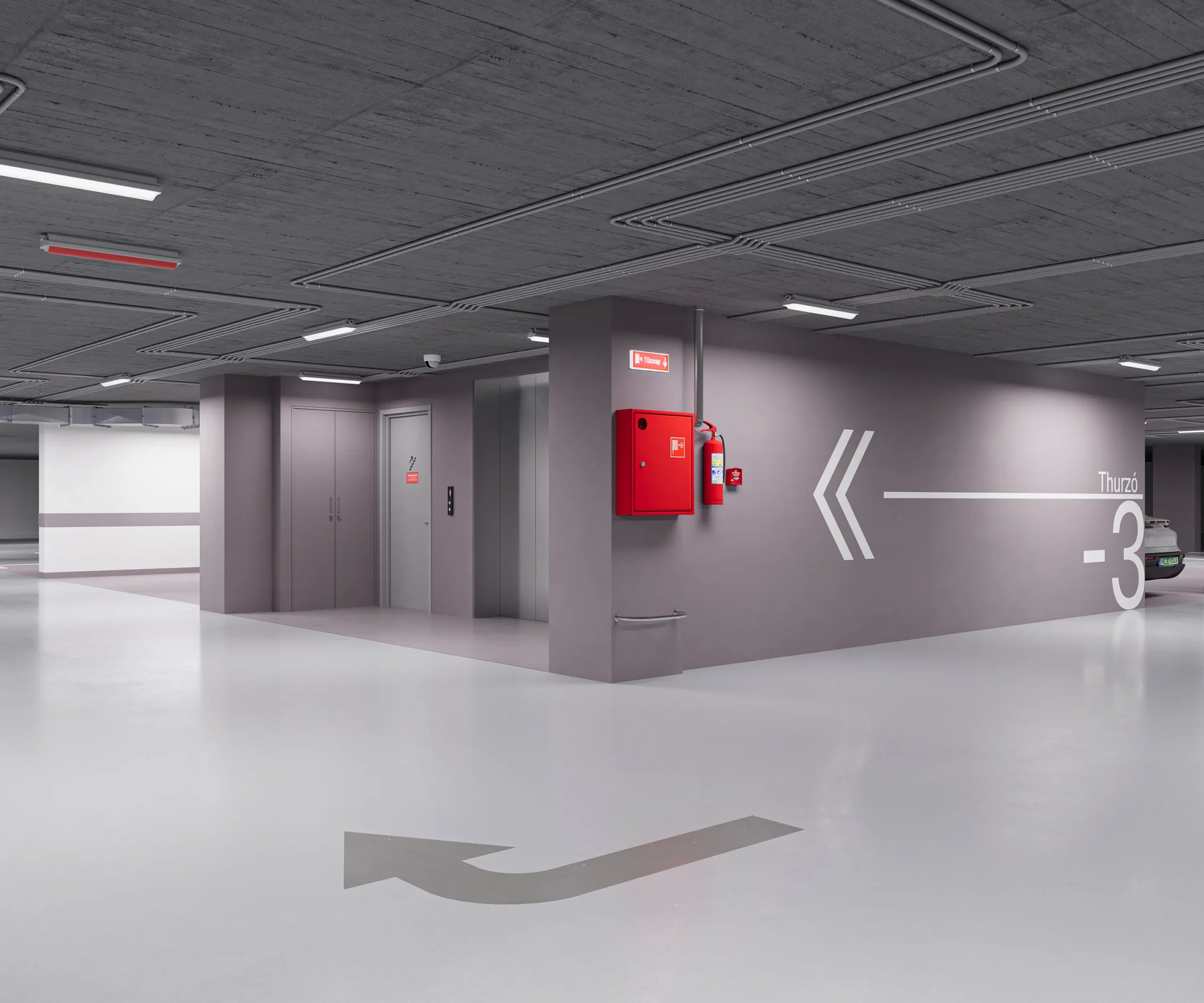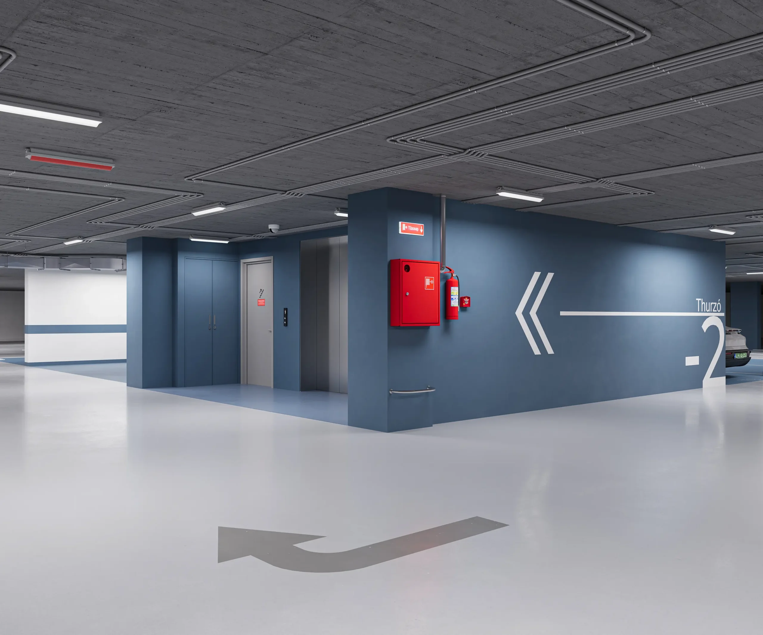 Az épület teljes területén egységes grafikai és signage rendszer segíti a tájékozódást, míg a mélygarázs szinteken ezt színkódolt kialakítás egészíti ki, biztosítva az átlátható és könnyen értelmezhető közlekedést.