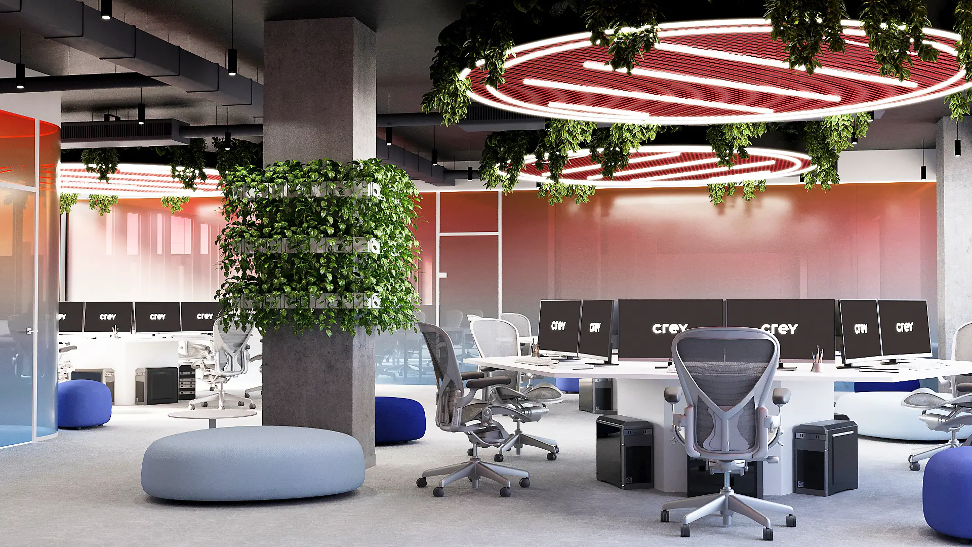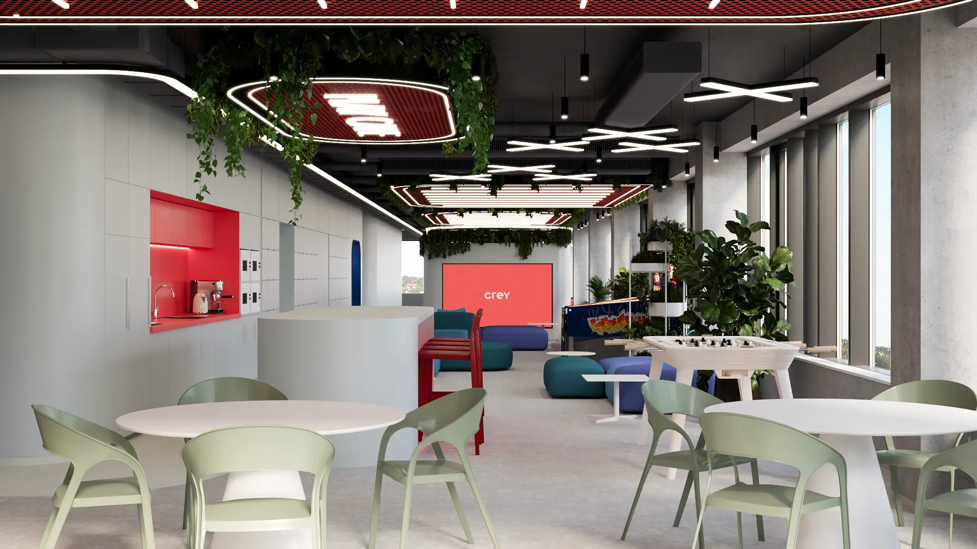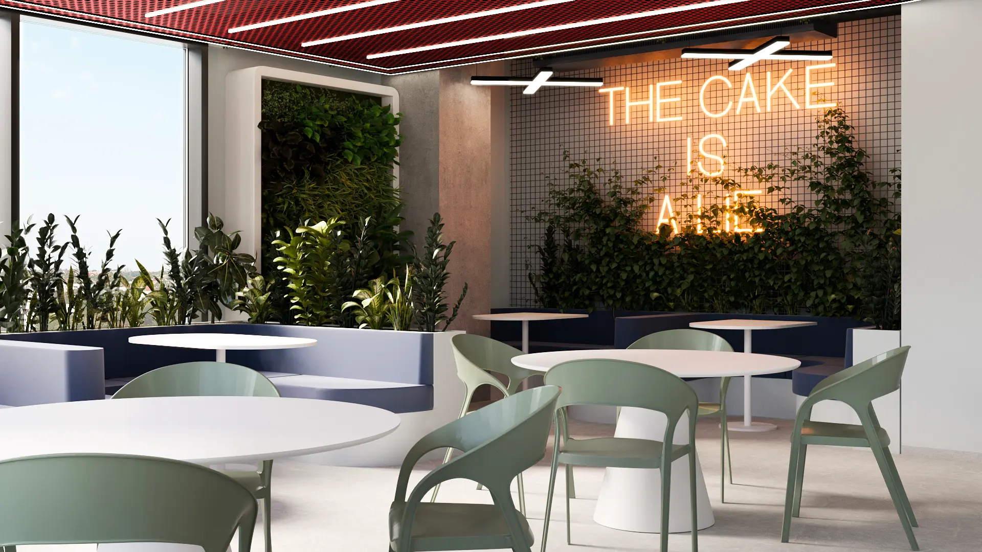 A mennyezeten lévő fekete akusztikai elem még jobban kihangsúlyozza a terekben domináló LED fényeket és élénk színeket. A belógatott álmennyezeti paneleken megjelenő növénysorok, a zöldfal, valamint a térben elszórt mobil növényládák gondoskodnak az iroda barátságos, otthonos hangulatáról.