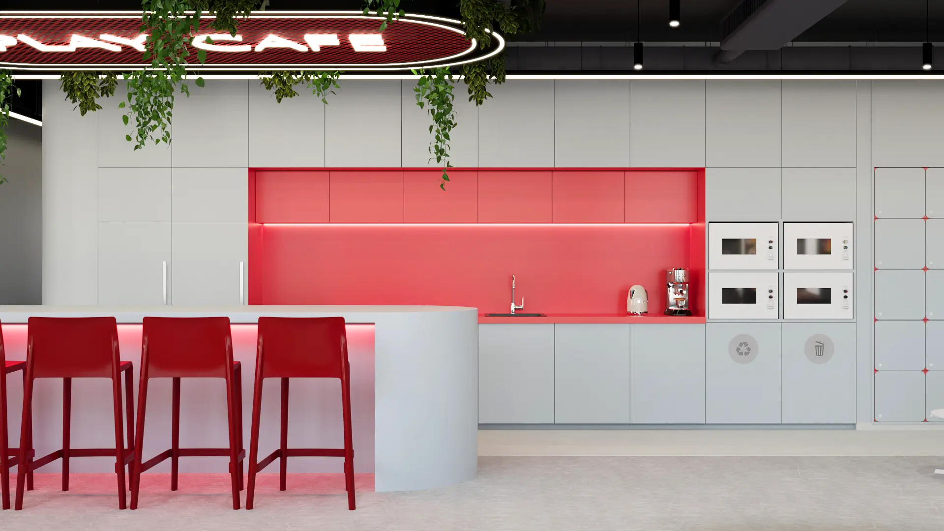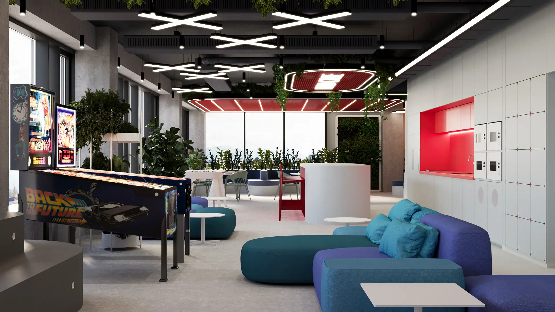 A számítógépes játékokkal foglalkozó cég belső tereinek kialakításánál egy színes, vidám, fiatalos munkatér megalkotása volt a cél. Az arculati korall szín mellé a kéket választottuk kiegészítésként, így egymással kellemes kontrasztot alkotva az egész irodateret meghatározzák.