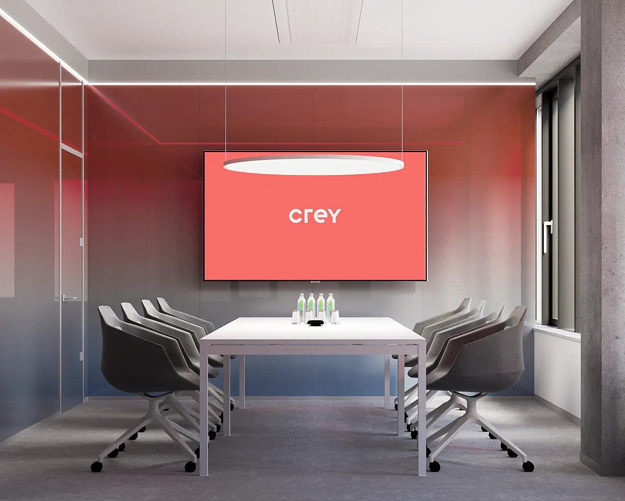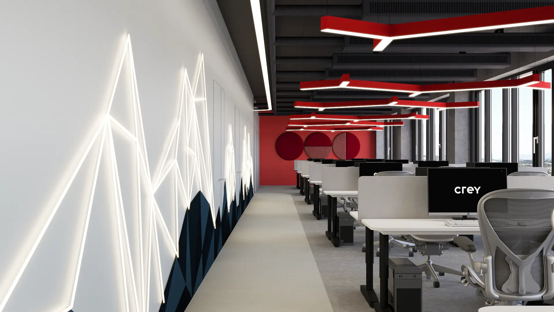 A két élénk szín mellé semleges szürke/fehér színvilággal terveztünk, melyek egységes hátteret biztosítanak az erőteljes színek mellé, biztosítva a világos és komfortos munkatereket.