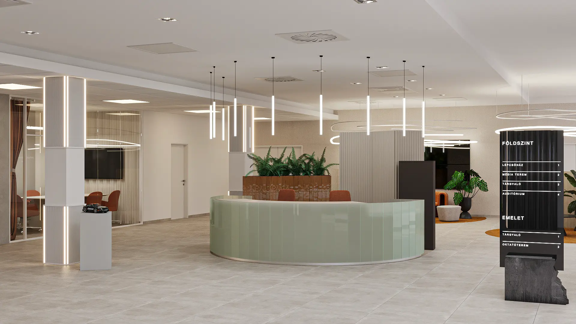 Az épületbe belépve a látogatót a tér központi elemét jelentő recepciós pult fogadja. Ennek hátoldalán elhelyezett szekrények tömege úgy tagolja a teret, hogy finoman leválasztja a várakozó részt, mégsem zárja el teljesen, így a két funkció szerves egységben marad. Az auditórium előtti váróteret kisebb szigetek tagolják, melyek szín- és formavilágukban a vállalat arculati elemeit követik.