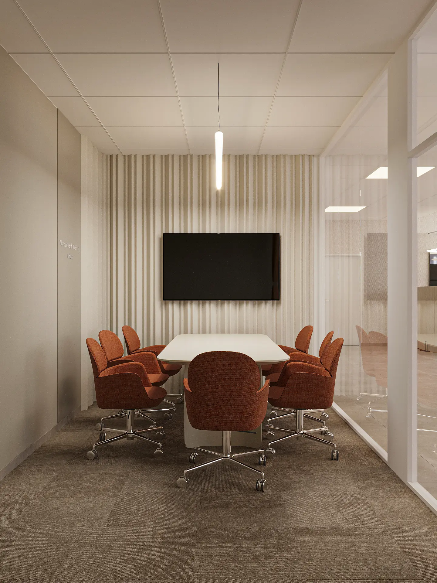A recepció közvetlen környezetéből egy vendégtárgyaló is nyílik. Ebben a helyiségben a hangsúlyt a karakteres, élénk narancsszínű tárgyalószékek adják, amelyek dinamikus kontrasztot képeznek a visszafogottabb, monokróm burkolatokkal. A burkolatok semleges színvilága tudatosan teremt kiegyensúlyozott hátteret, amely kiemeli a bútorok formavilágát és színét.