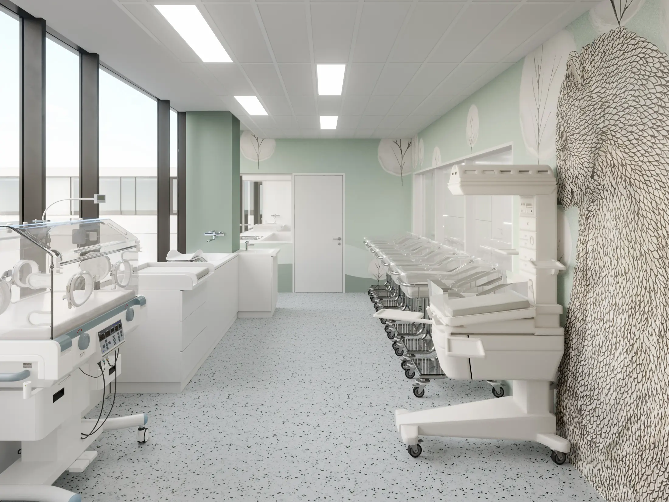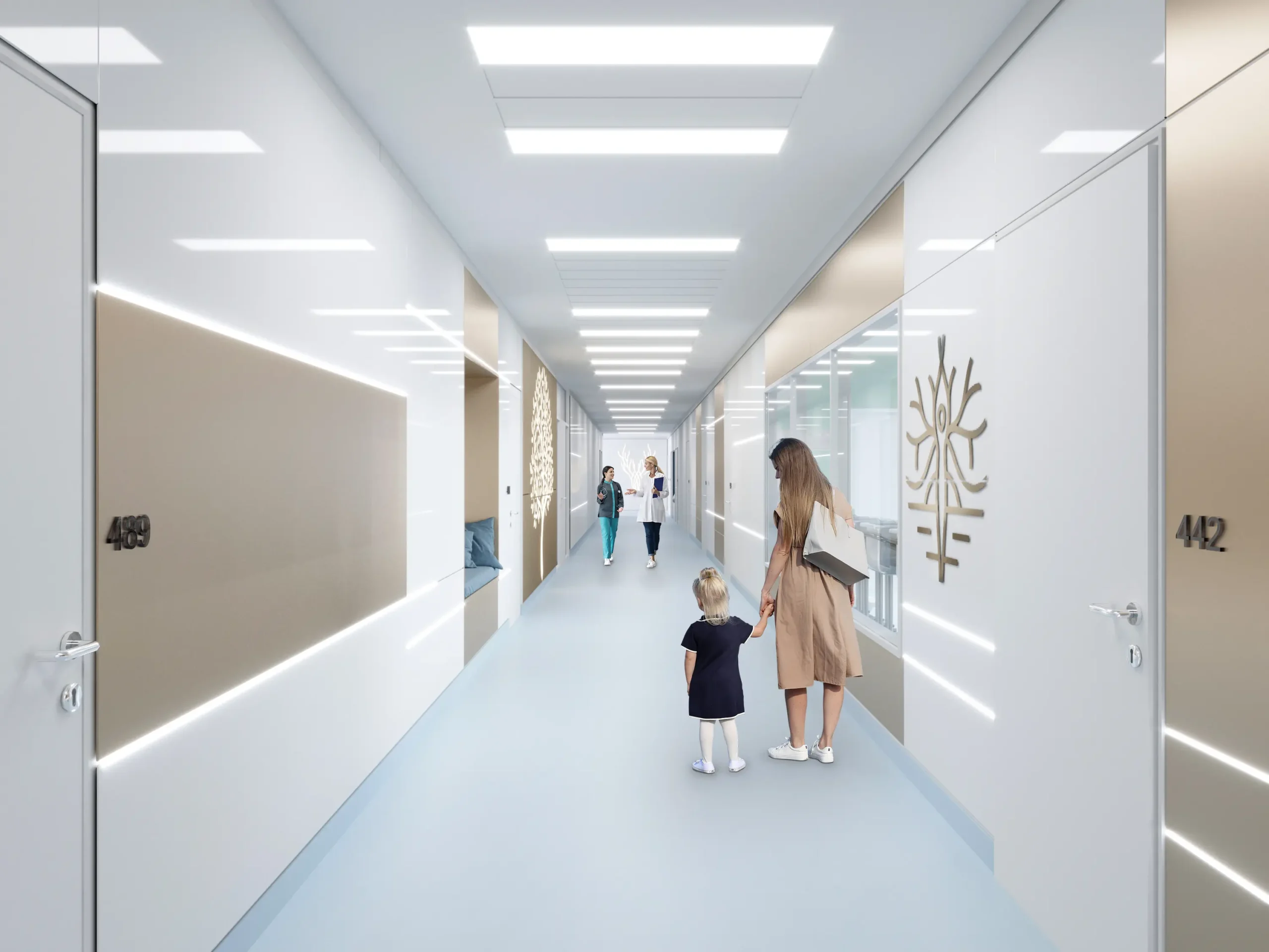 A Medicare (korábban Medicover) részére egy korábbi irodaterület átalakításával, generál tervezés keretében terveztük meg a Vision Towers 4. emeletén működő szülészetet. A tervezés során kiemelt szerepet kapott a szakágak összehangolása, melynek eredményeként az orvostechnológiai igények, a belsőépítészeti koncepció és az akusztikai megoldások harmonikus összhangban valósulhattak meg. Az új osztály funkcionális egységei közé tartozik a 15 ágyas gyermekágyas részleg, két szülőszoba, egy császárműtő kiszolgáló terekkel, csecsemőszoba és ellátó, valamint járóbeteg-ellátó és váróhelyiségek.