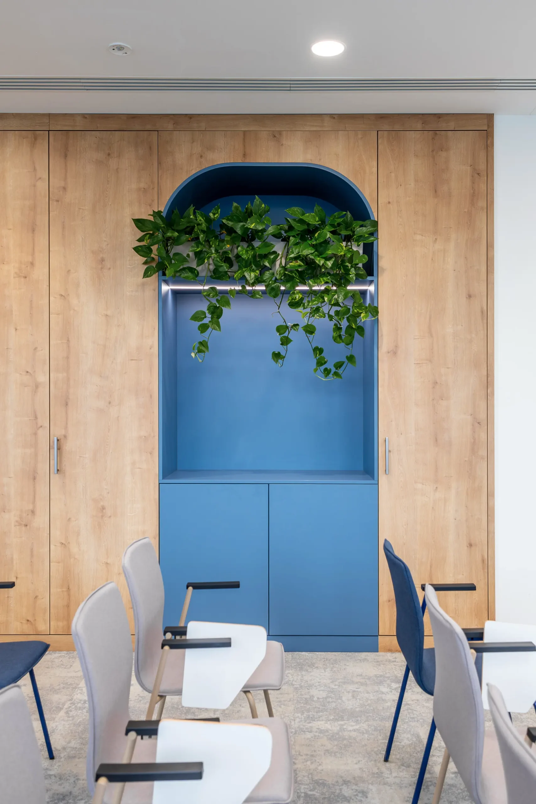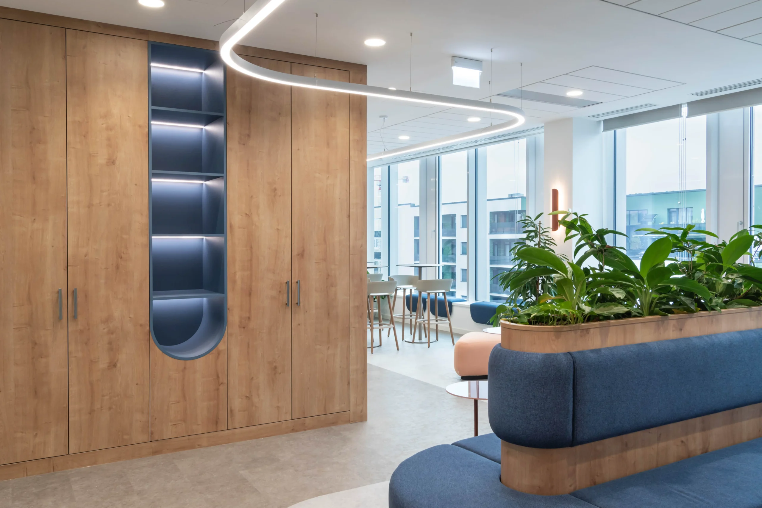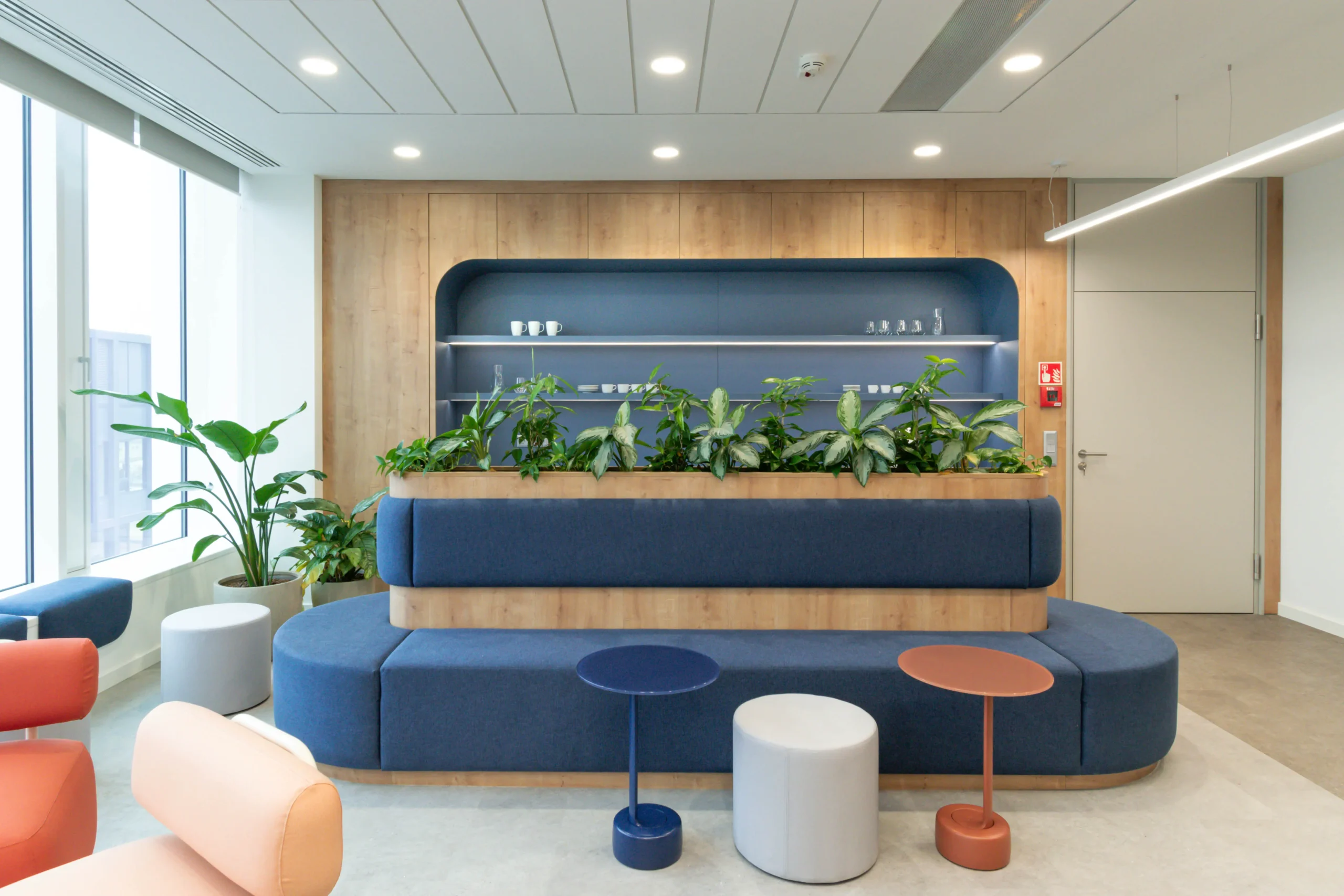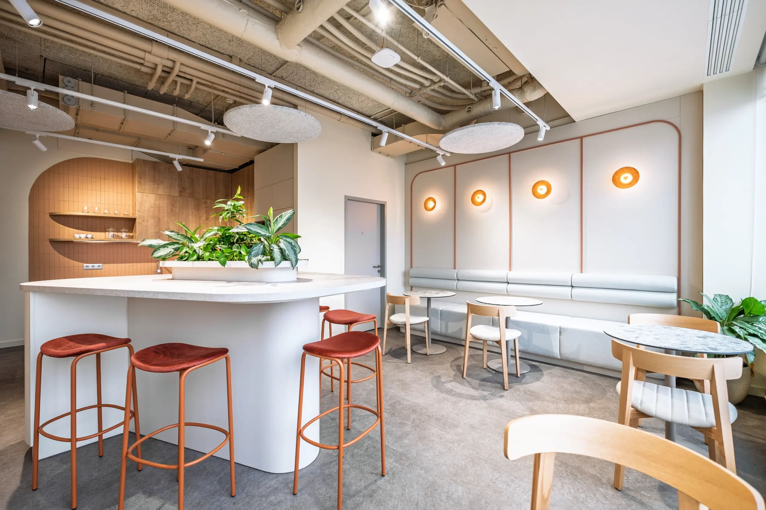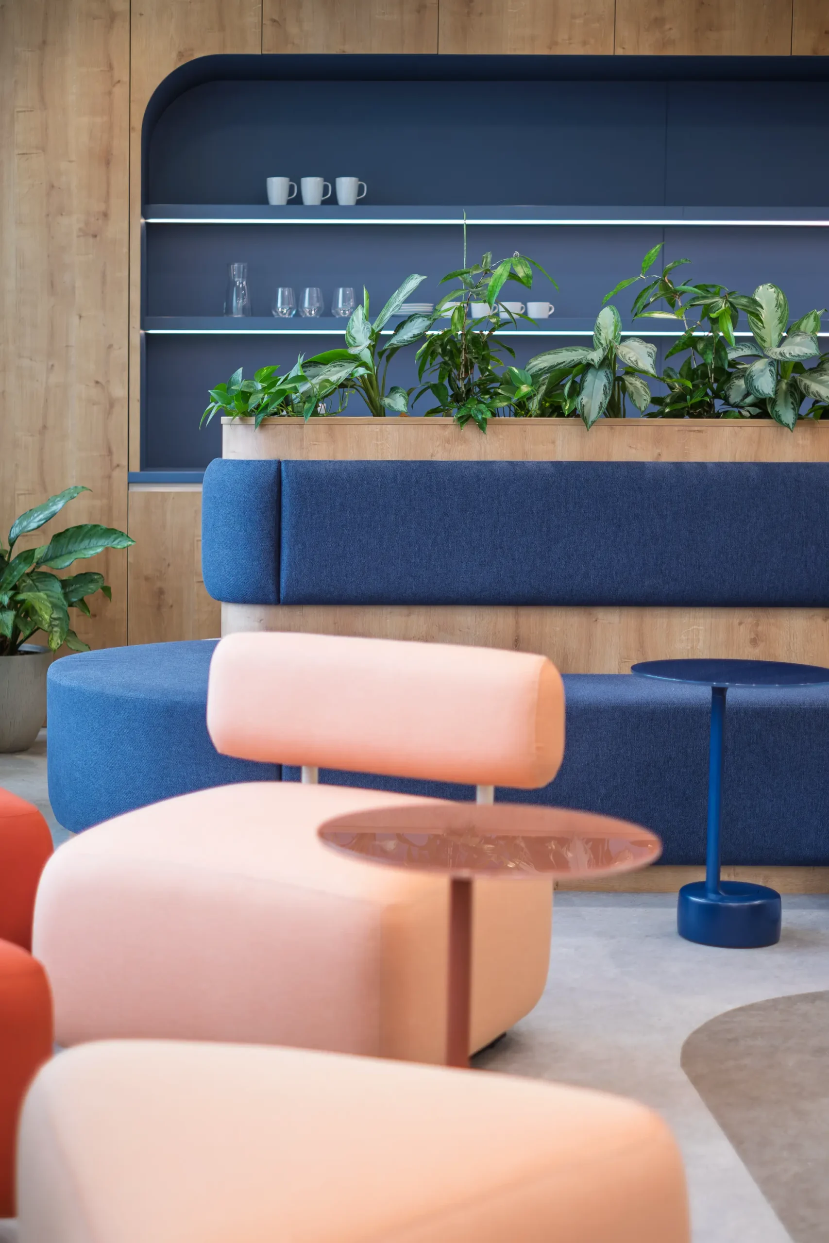 Az új épületrész színvilága igazodik a cég brand bookjában meghatározott arculati irányelvekhez, ugyanakkor melegebb, természetes anyagokkal is kiegészítettük, így az összhatás otthonosabb. A padlóburkolatok és a falak monokróm, visszafogott hátteret biztosítanak, amely kiemeli az élénkebb tónusú bútorokat, ezzel teremtve kiegyensúlyozott és harmonikus térélményt. A bútorok formavilágában hangsúlyosan jelennek meg az íves vonalak, amelyek oldottabb, barátságosabb atmoszférát kölcsönöznek a közösségi és munkahelyi tereknek.