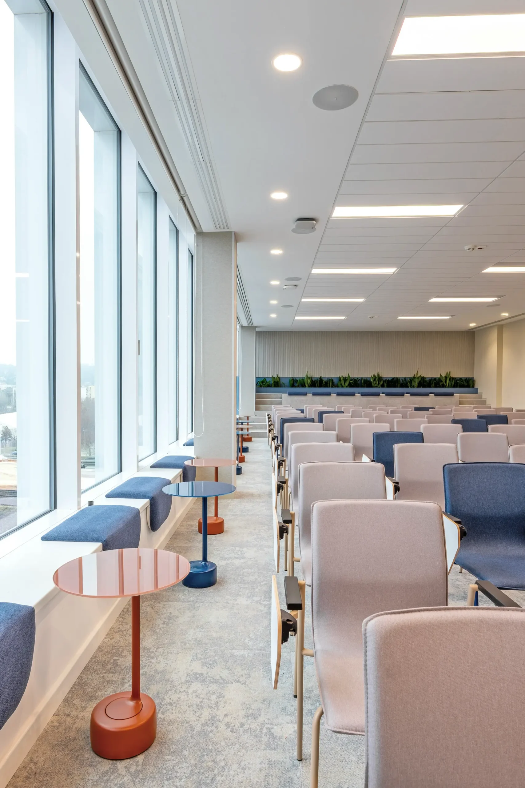 Az auditórium kialakításánál elsődleges szempont volt a rugalmasság. A tér változatos rendezvények igényeihez igazítható, nagyobb események alkalmával a terem végében kialakított dobogó, valamint a párkányokra helyezhető ülőpárnák biztosítanak további ülőhelyeket.