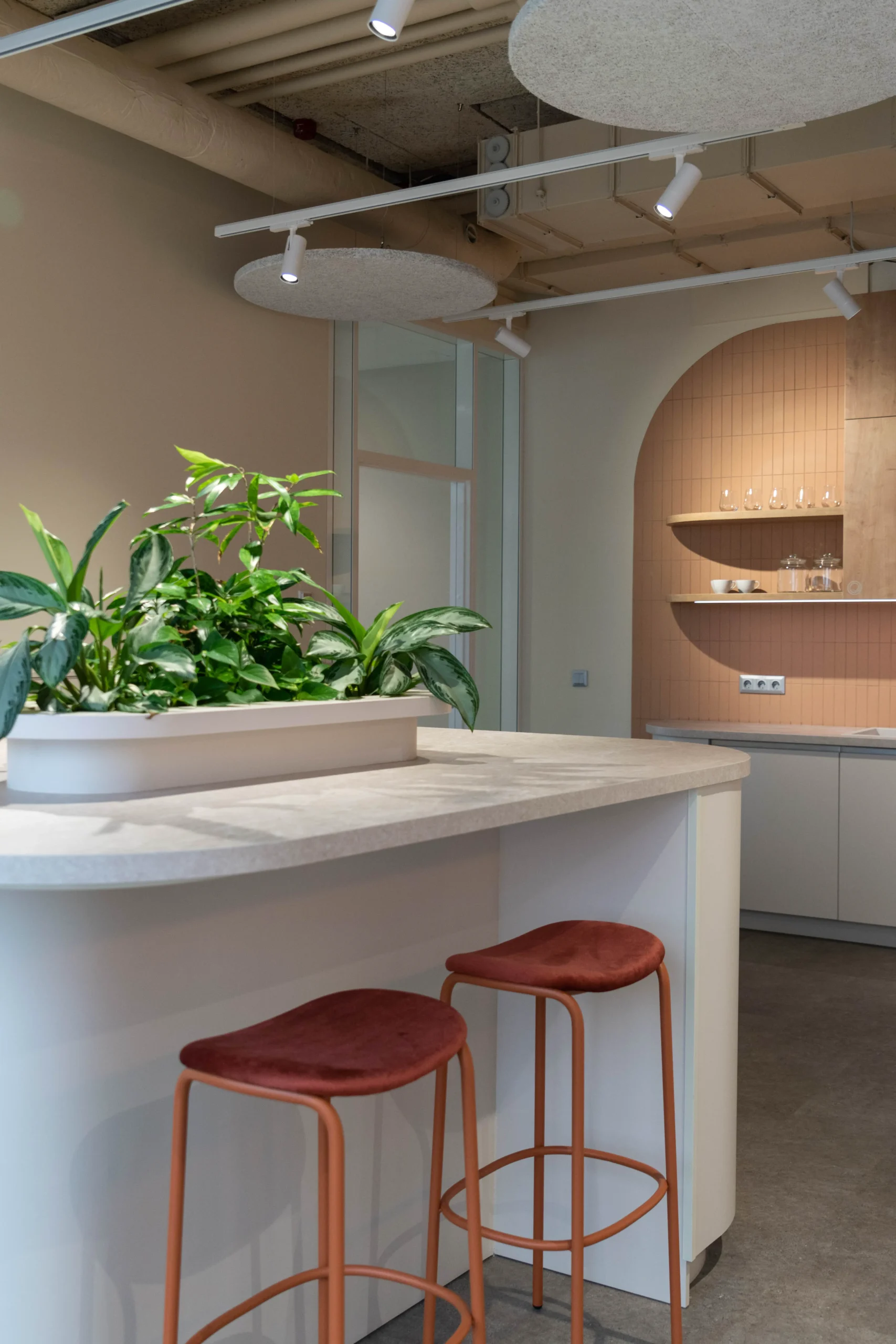 A szárny végében található konyha melegebb színhasználata tudatosan mellőzi a kék szín használatát. Ez a helyiség nyugodtabb, pihentető hangulatot sugároz, amely ideális környezetet biztosít arra, hogy a dolgozók egy kávé mellett rövid időre kiszakadjanak a mindennapi feladatokból, feltöltődjenek és új energiával folytathassák a munkát.