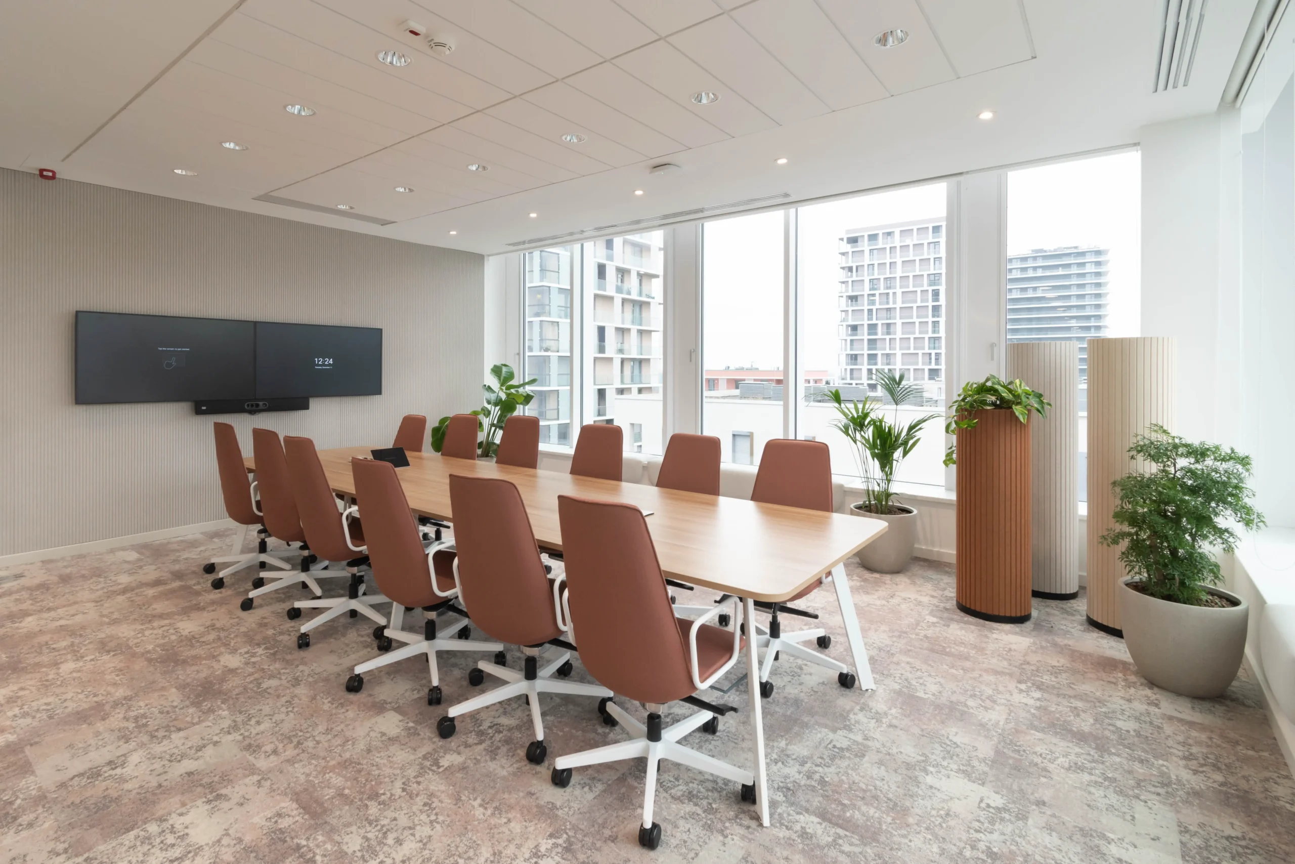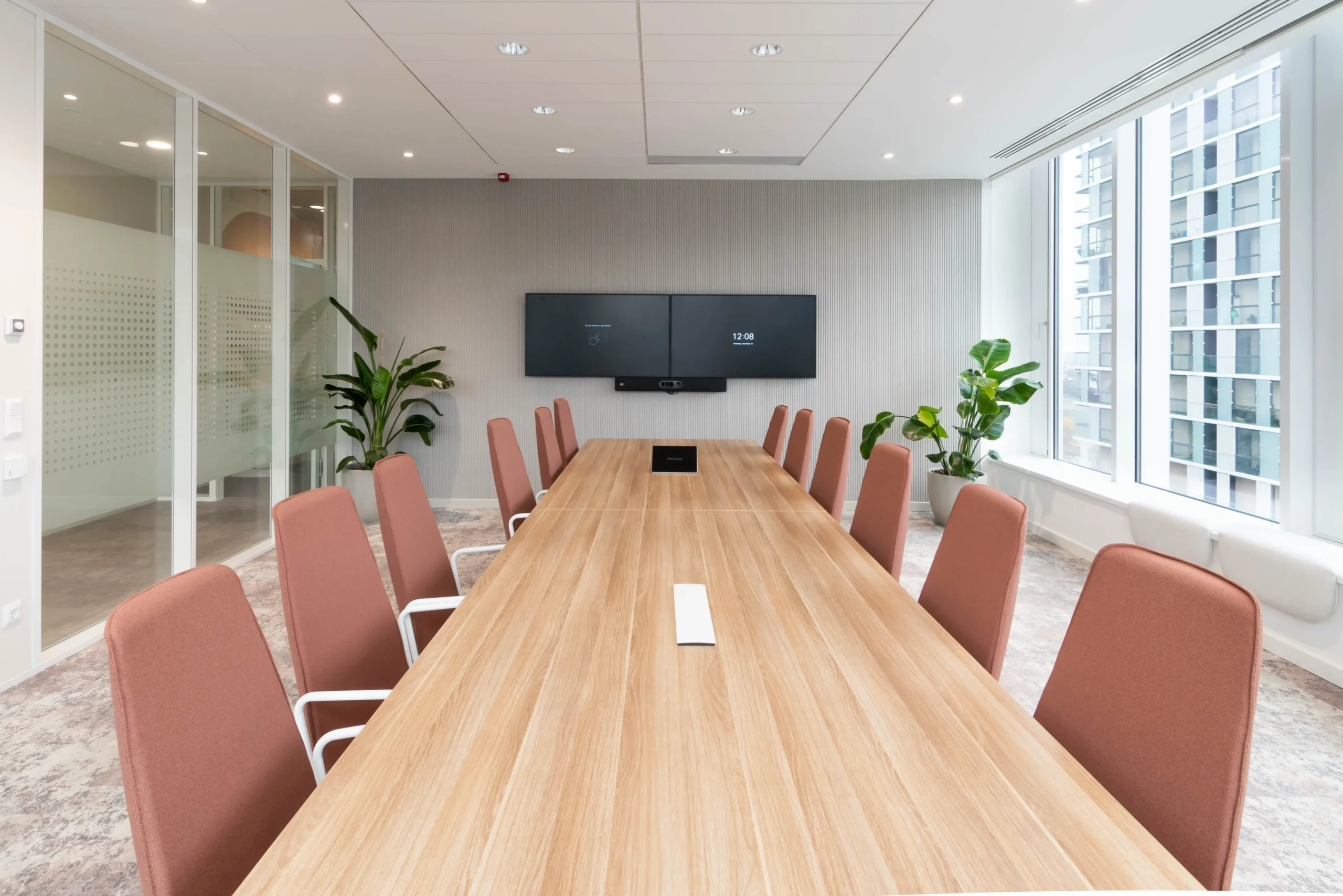 A nagy tárgyaló tervezésekor kiemelt figyelmet fordítottunk a megfelelő akusztika biztosítására, hiszen a tér három oldalról üvegfallal, illetve nyílászárókkal határolt. A TV mögött elhelyezett akusztikus burkolat, valamint a térben megjelenő akusztikai oszlopok gondoskodnak arról, hogy a tárgyalások tisztán és zavartalanul folyjanak, a visszhang és a hangterhelés minimalizálásával.